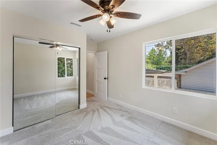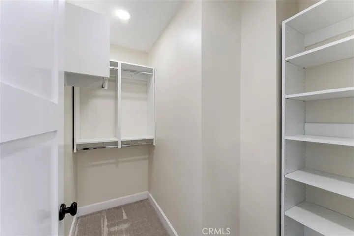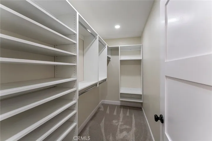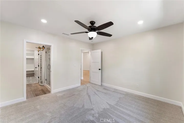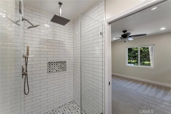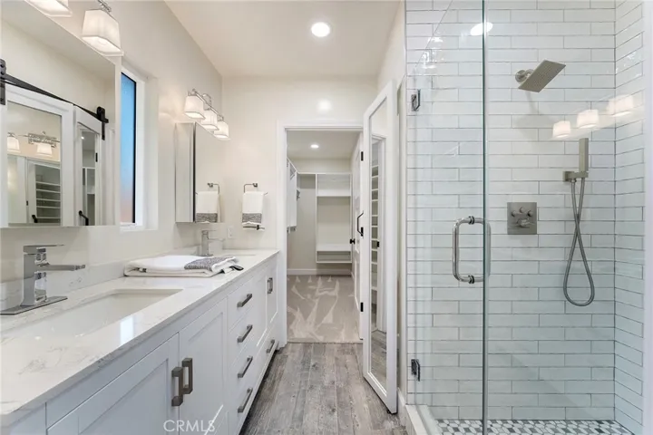 The main-level primary suite offers a custom walk-in closet and a spa-like bath with double vanities, oversized deco-tiled shower, and a mirrored barn door to the private toilet. Upstairs, two additional bedrooms feature custom closets and share a well-designed bath with a dual-access vanity.