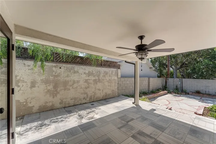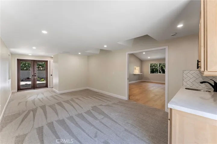 A versatile family/game room is perfect for entertaining, complete with a custom bar, sink, dual wine/beverage refrigerators, skylights, and French doors opening to two distinct patios—one covered with pavers and ceiling fan lighting, the other a serene hardscaped retreat.