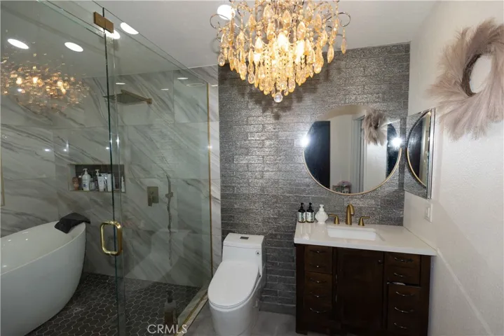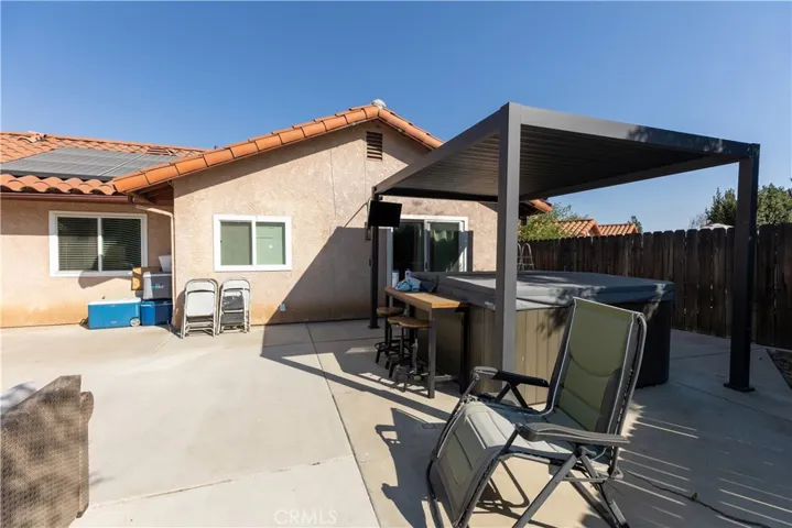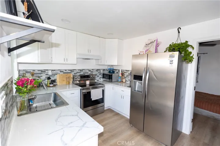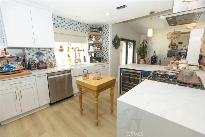The home has been beautifully upgraded, showcasing a stunning kitchen with white cabinets, waterfall quartz countertops, and a decorative tiled backsplash. Additional features include newer windows, new flooring throughout, a wine fridge, an upgraded primary bathroom, ceiling fans, solar energy, a tankless water heater, and newer A/C. This home is gorgeous!