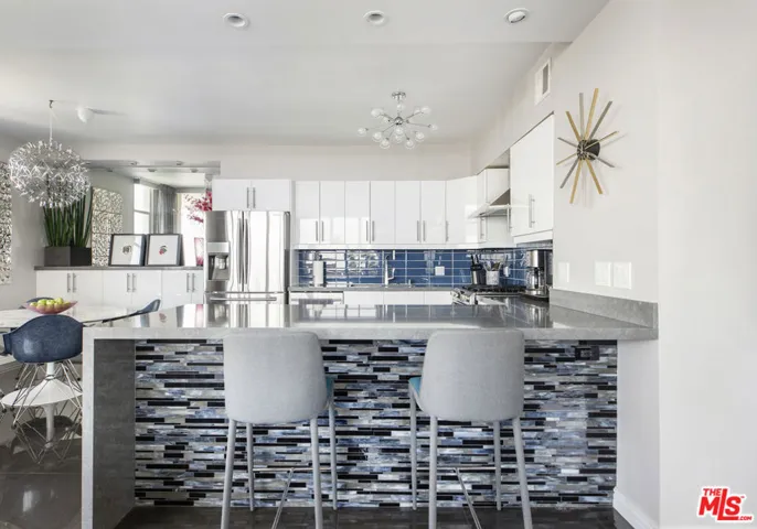 Seamlessly blending style, sophistication and bold design, a statement 1BR/1BA + den. SW corner home in Los Feliz’s most vibrant hi-rise is an expression of desirability. Swing open the distinctive front door and step into the pristine, as a customized architectural wall for treasured art and stunning hi-gloss floors instantly set the tone. Proceed a few steps and explore exquisite inlaid glass tiles, an elegant treat captured throughout the home. Floor to ceiling windows/sliders allow drenching natural light and glamourous views from DTLA to the Pacific Ocean, while chic blinds close at the touch of button to lock-in sensuous privacy as desired. The large, open floor plan features special den/sitting area, an ideal location for quiet contemplation or catching up on reading. (Architectural Digest, New Yorker or Cosmopolitan subscribers sure to feel equally comfortable.) Chef’s kitchen out of a designer showroom features stainless appliances, gorgeous stone counters (with seating space for martini sipping!), under-cabinet LED lighting and adjacent dining area. The luxury continues with an oversized spa-like bathroom, featuring breathtaking tiling + rain shower + soaking tub, gorgeous blackout draperies in the bedroom, plus a 24-hour doorman, security, pool + gym + 2 parking spaces. Your sanctuary for grown-up living awaits,