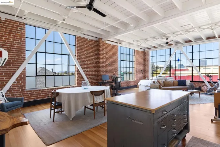 Stunning top floor corner unit overlooking the Laney soccer field and with Skyline views towards downtown. This secure building with deeded secure gated parking is a stunner. Remodeled with floor to ceiling cabinetry in the chef’s kitchen with 5 burner Bosch stove, vent hood and dishwasher, plus almost floor to ceiling wardrobe in the remodeled bathroom (with more storage above). On demand hot water and Hydronic heating and in unit laundry. Automated Roller shades deploy to shield you from the abundant afternoon light that streams in thru the massive & gorgeous metal framed windows. Seismic retrofit steel beams and 2 ceiling fans add a functional & beautiful industrial touch complementing the 14’ high ceilings, exposed brick walls and refinished softwood floors. One of the most impeccably well-run condos by Lake Merritt with a recent roof replacement, healthy reserves and low monthly fee $498.26 monthly. Plus: Secure mail area, freight elevator or internal stairwell entry, community BBQ area & secure assigned storage. Easy walk to Lake Merritt BART, Lake Merritt and the Oakland Museum’s weekly Friday night events!!