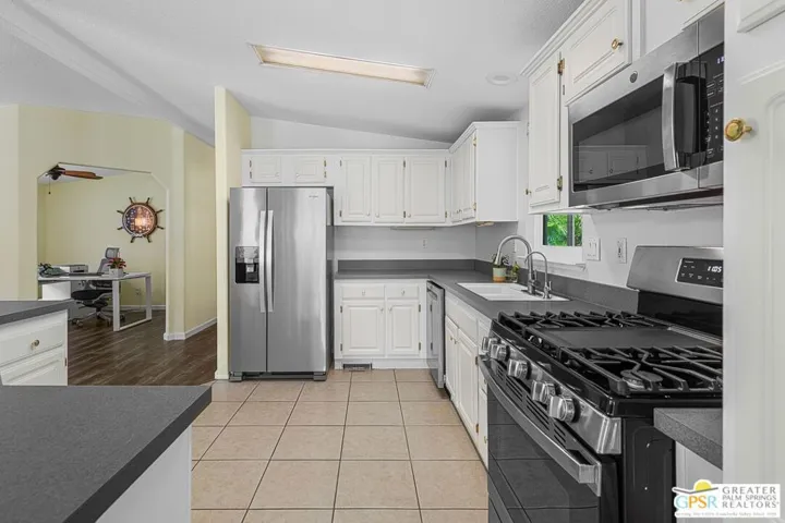 Built in 2000, light, bright, inside and out and move-in ready, this meticulously maintained 1,416 sf 2BR/2Ba with den/office home features high ceilings, interior laundry room, covered back porch, and an impressive 2 car garage. The open concept kitchen features bar seating and stainless steel appliances, perfect for contemporary living. The primary bedroom features an ensuite bathroom with linen and storage spaces and generous closet space. Freshly carpeted guest bedroom adds comfort and style. The side and back yard provide plenty of entertaining space and the attached garage with additional storage sets this home above and apart from the rest. The Canyon’s amenities include 2 sparkling pools and spas, a welcoming clubhouse with banquet facilities with a stage, perfect for hosting events. The fitness room, billiards, indoor shuffleboard, are surrounded by wonderful park-like greenbelt grounds with tennis and pickleball courts. Residents must qualify at time of purchase with 3x space rent $931 = $2793 and a FICO score of 750. 1 pet is allowed weighing no more than 20 lbs. Buyers and their agents to verify current space rent fees and square footage.