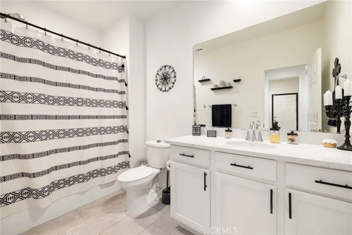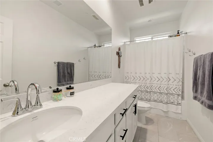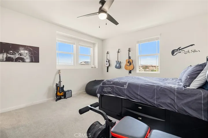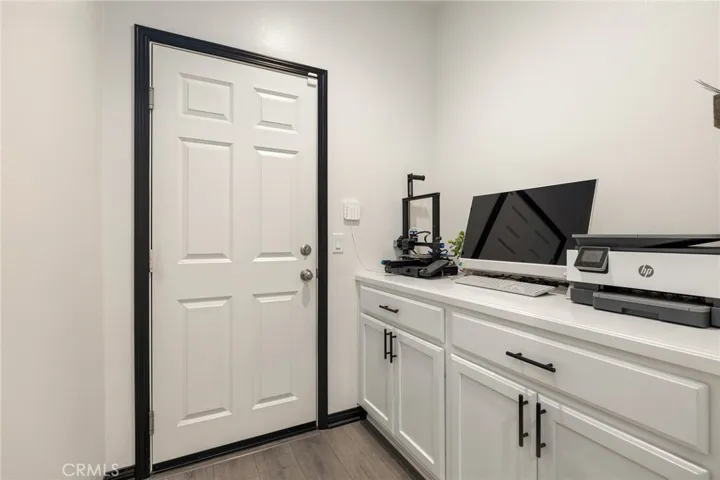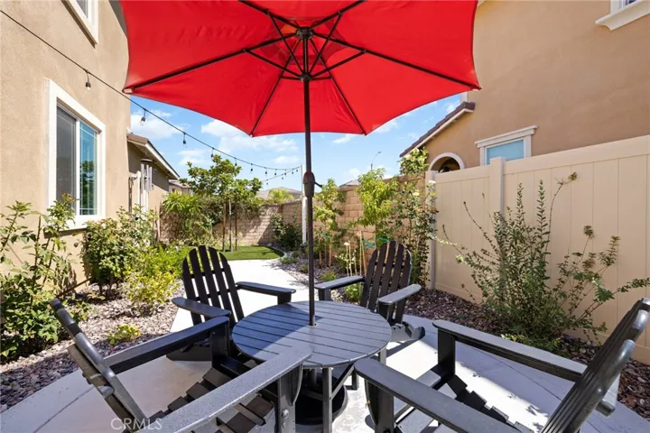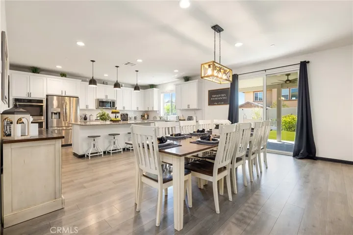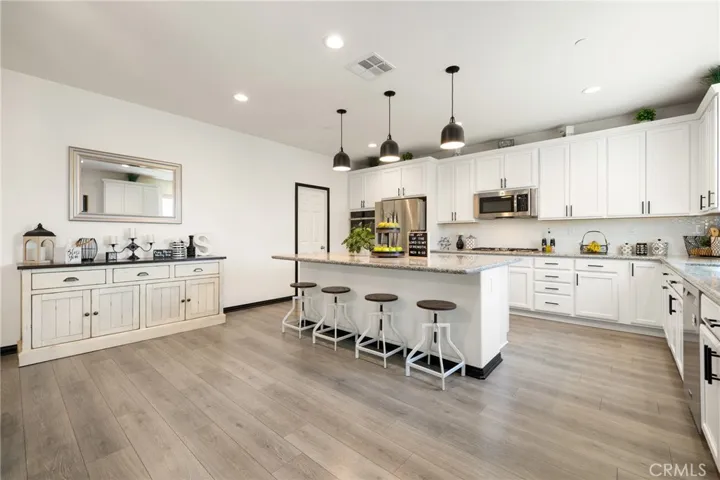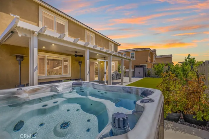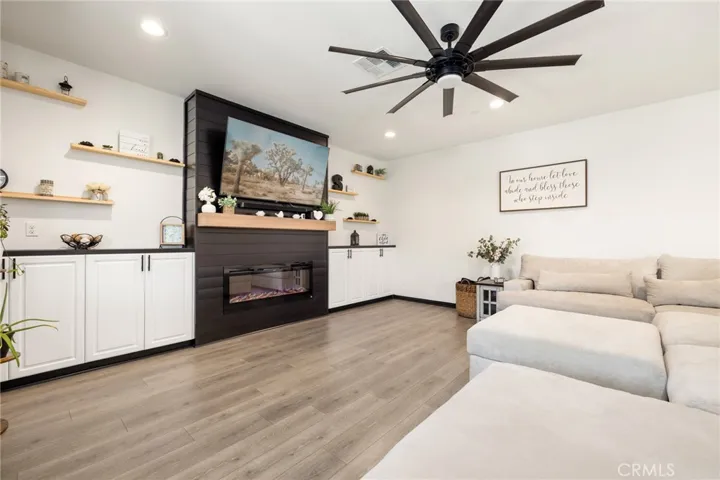 When it comes to modern living this is the one! With upgrades galore, 6 bedrooms, 4 bathrooms, OWNED solar, and an above ground spa, this home literally has it all! The 2021 built Richmond American home features white and black finishes, on a cul-de-sac and is located in the highly desirable community of Audie Murphy Ranch in Menifee, within feet of the new Kathryn Newport middle school. The front curb appeal offers drought tolerant landscaping, and a cozy porch with stunning mountain views. Inside the home you are greeted by soaring 30 foot ceilings, LVP floors and a desirable floor-plan offering 2 main floor bedrooms. The first bedroom is appointed with upgraded carpet, a black wood accent wall and offers a full bathroom boasting a single vanity, and shower-tub combo. Across the hall is a large, long room that offers three built-in desk spaces and custom built-in cabinets, which is perfect for an office or flex space! The two car garage offers EV charging capability and the whole house filtration system and water softener. The large Great Room offers the most beautiful custom electric fireplace in a black shiplap inset surrounded by custom cabinets. The dining area is large enough for a huge farm table and flows into the chefs kitchen. This space is appointed with granite counters, an eat-up island, honeycomb backsplash, black pendant lighting, stainless steel appliances including a new dishwasher, double oven, 5 burner stove, RO water filtration system, and walk-in pantry. The grand staircase features a custom black chandelier, wood accent wall and upgraded carpet. The second story boasts a whole house fan, 3 large secondary bedrooms with one offering a walk-in closet and the other room acts as a junior suite with it’s own full attached bath. The others share a full secondary bath. The large laundry room boasts a built-in folding table and storage. The Primary suite is appointed with a custom electric fireplace surrounded by shiplap and a floating mantel, a wood accent wall and beautiful barn door that leads into the primary bath featuring quartz counters, a quartz lined shower and tub and a large walk-in closet. The romantic yard is appointed with a large aluma wood patio cover with recessed lighting and ceiling fans, concrete for entertaining, artificial turf, many different fruit trees, a rose garden and secret garden oasis. The community offers a club house, pools, spa, skate park, trails, sports parks and the award winning Taawila ES.