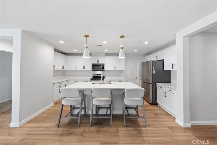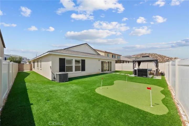 Welcome to this rare single-story gem featuring 4 bedrooms, 2 baths with over 2,000 sq. ft. of beautifully updated living space. The large open-concept living, dining, and kitchen areas flow seamlessly together, highlighted by fresh 2024 LVP flooring, recessed lighting, plantation shutters, and a double sliding glass door that floods the home with natural light. The modern kitchen boasts crisp white shaker cabinets, sleek white quartz counters, a gas stove, wine fridge, and plenty of space for cooking and entertaining. Step outside to your private backyard oasis with low-maintenance turf, lattice-style concrete pavers, vinyl fencing, and an aluminum gazebo—perfect for relaxing or hosting guests. Additional features include an alarm system, tankless water heater, drought-tolerant landscaping, and fresh paint. Just steps from a giant park, this home offers the perfect blend of comfort, style, and location.