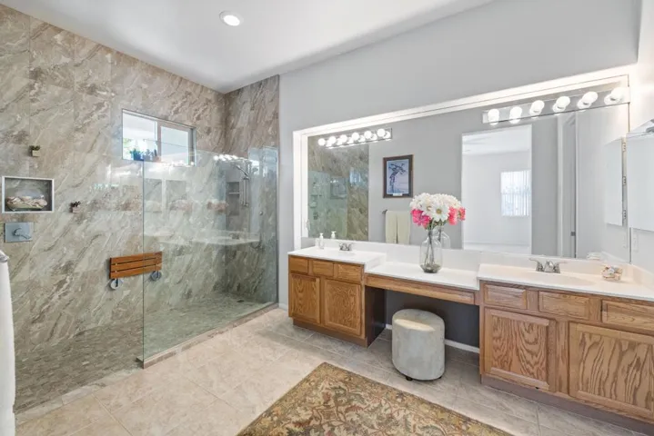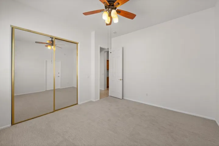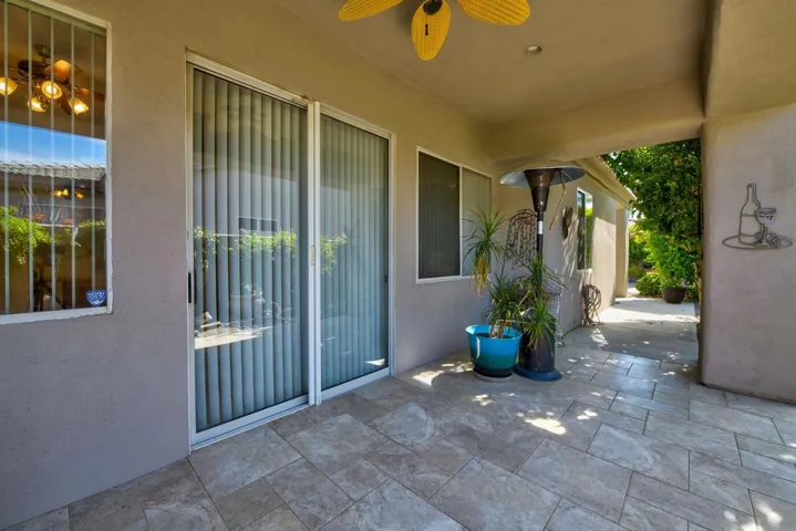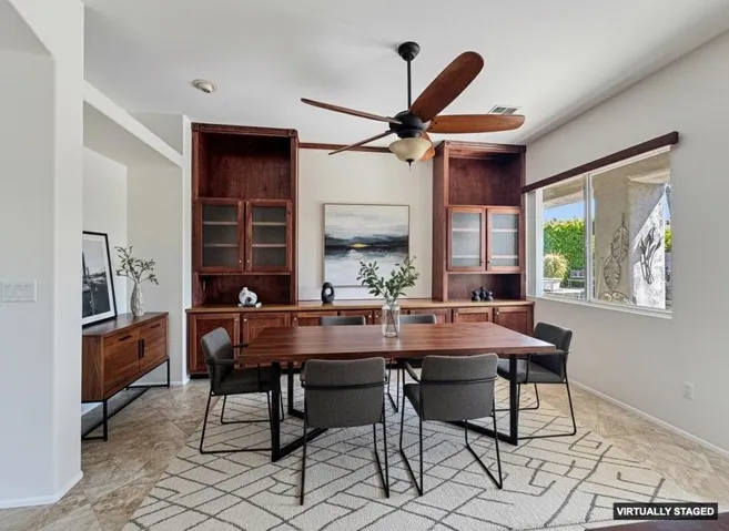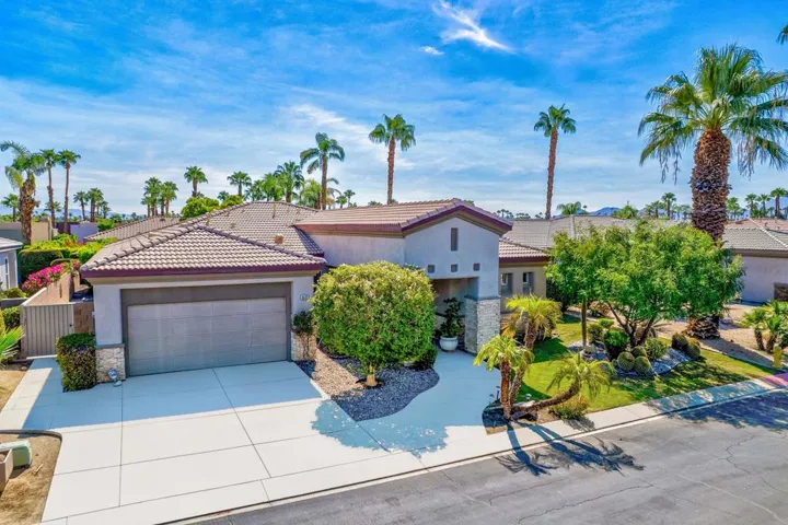 Location, Location…and this home comes with an *ASSUMABLE VA LOAN* current loan is at 2.375%. Nestled in a small gated community of Aldea Vistas located on the Cathedral City and Rancho Mirage border (@Gerald Ford & Da Vall Dr.) 3 Bedrooms, 3 Baths & a flex room currently configured as a Den with built-ins. Home Features 10 Ft. ceilings throughout & Solar Tubes bring in extra light. Freshly Painted Inside & New Carpet in Bedrooms. Formal Living Room & Family Room with built-ins. Open plan kitchen with island & lots of storage. Primary Suite has Walk-In Closet with built-ins, Remodeled Shower & Dual Sinks in Bath. Individual Laundry Room w/cabinetry & sink. Direct Access to Double Car attached *Garage with AC* 8 Panel owned Solar system. Established landscaping with mist system, a Spool & Waterfall. Community has walking path and greenbelt area for socializing and/or dog walking. You Own The Land. Perfect Mid-Valley location, close to Shopping & Golf. 15 minutes to PS Airport and 15 minutes to famous El Paseo Shopping area. 1/2 mile from Palm Valley School. Low HOA Dues. Don’t miss out on this opportunity. Priced to sell, hurry this one won’t last!
