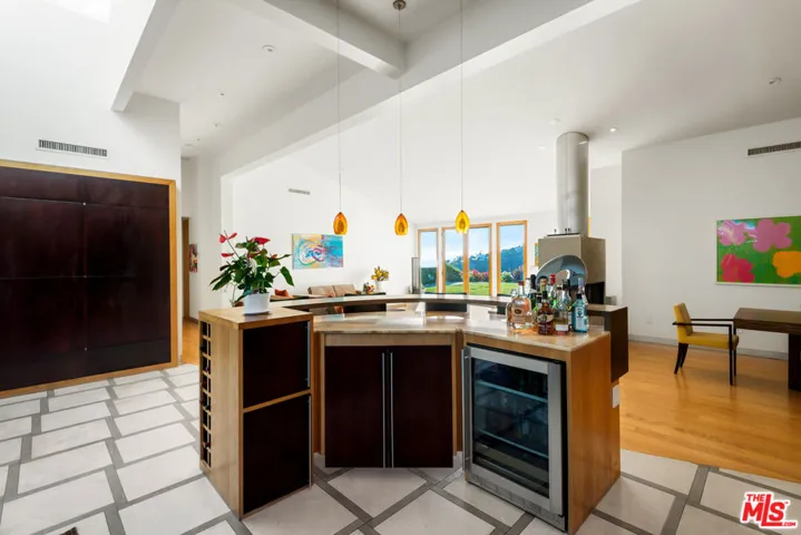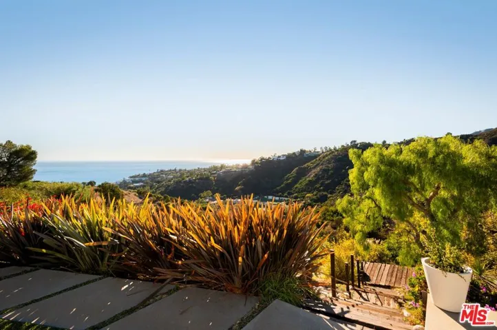 This Pacific Palisades custom-built luxury home in the beautiful Marquez Knolls neighborhood is available for short-term and long-term rent to qualified applicants. The modern architectural home comes fully furnished, including custom-made Italian couches, bedframes, dining tables, chairs, and coffee tables. Built in 2007, the home is in excellent condition with hardwood and stone floors throughout and carpet in the bedrooms. Nearly every room offers beautiful ocean and mountain views, including the living room, master bedroom, and junior master bedroom. The master bedroom features a fireplace, heated floors, a jacuzzi tub, and a steam shower. The kitchen is equipped with modern appliances, including a Sub-Zero refrigerator, WOLF stove, and built-in Miele coffee/espresso machine. The property includes a two-car garage and a large gated driveway that can accommodate three additional vehicles. The large backyard has two levels: the main level includes a full BBQ and bar area with seating for entertaining while enjoying the ocean and mountain views, and the lower level features a wooden loggia with a firepit and built-in seating, ideal for watching the sunset. Fruit trees line the backyard staircase, adding to the charm of this exceptional home.
