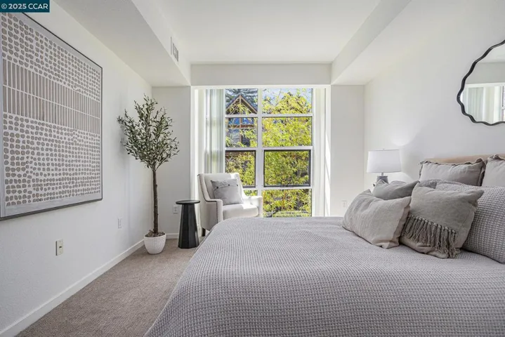 Freshly updated in May 2025 with new HOA approved, luxury vinyl plank flooring, fresh paint, new carpet, some new lights, refurbished bathroom & kitchen grout; this condominium has a fresh contemporary feel. Perched on the third floor, it is flooded with afternoon sunlight and is a peaceful retreat from the bustle of downtown Walnut Creek. The kitchen is a dream—equipped with stone countertops, a Sub-Zero refrigerator, gas range, microwave, and a storage pantry. The inviting living room features a cozy fireplace as its focal point, perfect for relaxing on cold weather evenings at home. A laundry room includes full-size washer and dryer along with additional cabinetry for effortless organization. The primary bedroom features generous closet space and a bathroom with a luxurious soaking tub and a separate walk-in shower. Situated at the MERCER, there is an impressive array of resort-style amenities: a large lap pool, spa, BBQ area, outdoor shower and fireplace, and a clubhouse. Step out and enjoy everything downtown has to offer—top-rated restaurants, boutique shopping, and live performances at the Lesher Center for the Arts, located just across the street. With BART only two blocks away, this location is as convenient as it is vibrant! A refined urban lifestyle awaits.