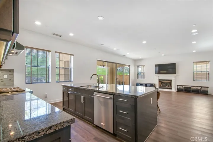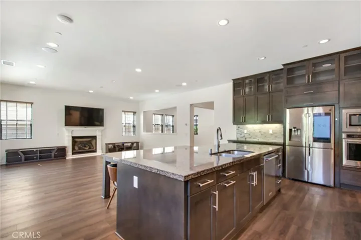The impressive entry welcomes you with high ceilings, recessed lighting, and abundant natural light from numerous windows. The expansive gourmet kitchen is a chef’s dream, featuring granite countertops, a large island with sink, top-of-the-line appliances (microwave, refrigerator, and oven), and a huge walk-in pantry. The open floor plan seamlessly connects to the dining and living areas, perfect for entertaining.