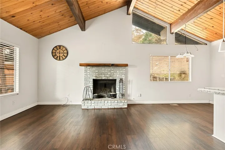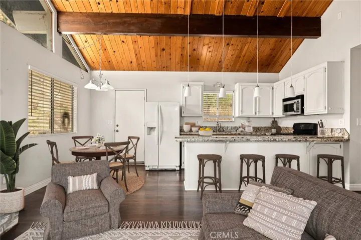 This inviting cabin offers a comfortable open floor plan with vaulted wood ceilings and a cozy fireplace, creating a warm and welcoming mountain atmosphere. The kitchen has been thoughtfully updated with quartz countertops and generous storage, making it ideal for everyday living or weekend escapes.