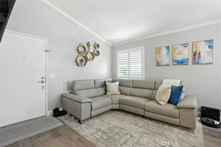Beautifully Remodeled Upper. Light and bright 2-bedroom, 2-bath Mission Viejo Condo in the sought-after Las Palmas community. This upper-level home features vaulted ceilings, an upgraded kitchen with newer white cabinetry, quartz countertops, recessed lighting, an electric 4-burner stove, and a built-in microwave. A convenient laundry closet is located right in the kitchen for easy access. Enjoy newer double-pane windows and a sliding door that opens to your private balcony/patio—perfect for fresh air, evening BBQs, or simply relaxing outdoors. The home offers laminate flooring throughout for a modern and low-maintenance touch.