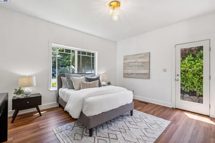 A gracious entrance and circular driveway offer an elegant welcome to this versatile single-level mid-century ranch in Lafayette’s coveted Burton Valley. Inside, beautifully updated spaces include four bedrooms and a bright, open layout. The main living area flows to a side patio off the kitchen, while the expansive primary suite offers large windows, sliding doors to the backyard, and a luxe ensuite with soaking tub, dual sinks, stall shower, and laundry. A bonus room off the primary makes an ideal office or sitting area. Two bedrooms share a dual-access bath, and a fourth—used as a family room—features an adjacent remodeled full bath and opens to the backyard. Don’t miss the second half of the lot over the wood bridge and creek, offering tons of upward and outward expansion potential. Fresh paint, new lighting, refreshed landscaping, and an attached 2-car garage complete the home. Enjoy suburban tranquility, top-rated schools, outdoor recreation, and easy access to shopping, dining, BART, and Hwy 24.