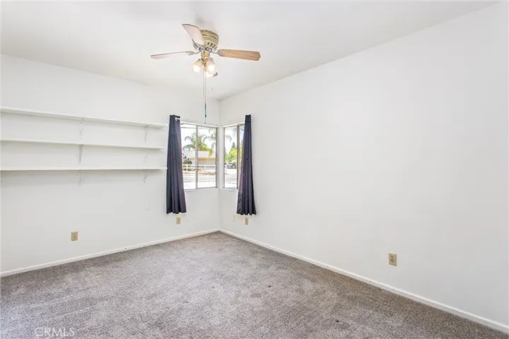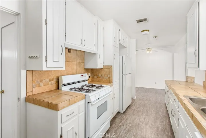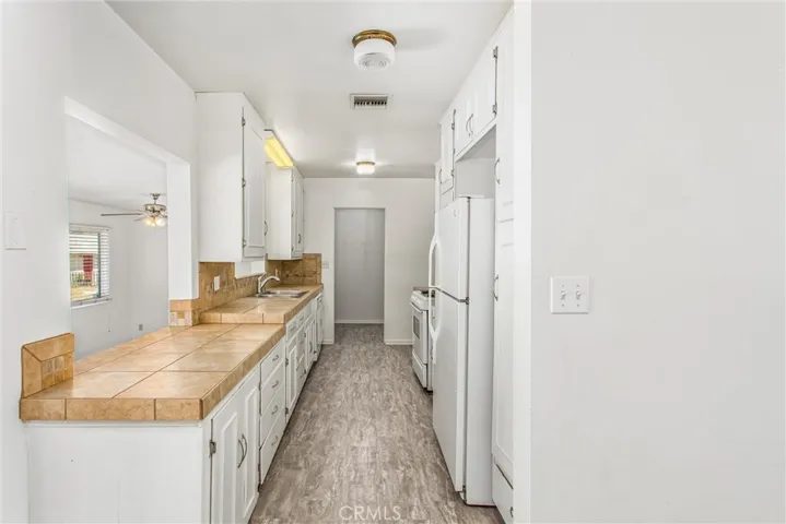 Welcome to your next home in Yucaipa! This charming residence offers a spacious, light-filled family room with a classic brick fireplace—perfect for cozy evenings. The long galley-style kitchen features white cabinetry, tile countertops, and a view into a versatile second living area or dining space, both enhanced by ceiling fans for year-round comfort.
