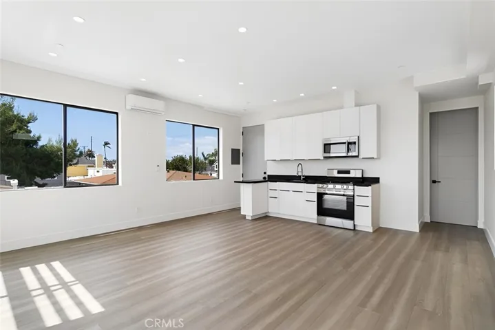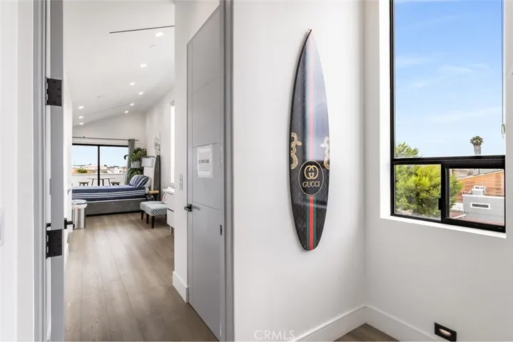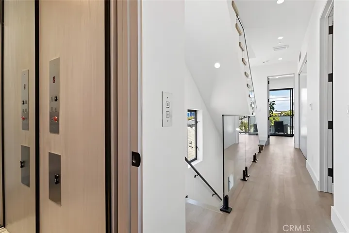 Approximately 3,364 square feet in total, the residence is served by an elevator to every level and framed by expansive upper front and rear decks with views that reach toward Newport Beach and the Angeles Mountains. The main living area is crafted for effortless entertaining, opening through a 10 foot corner sliding door to a front yard lounge with a gas fire pit. Inside, a sleek kitchen features top tier stainless steel appliances, custom countertops, a large center island, and a wine refrigerator, while glass railings, unobstructed balconies, and a glass railed staircase keep sightlines open and modern. An adjacent family room with a fireplace and flat screen television is ideal for gatherings. Modern window treatments give each room a tailored finish.