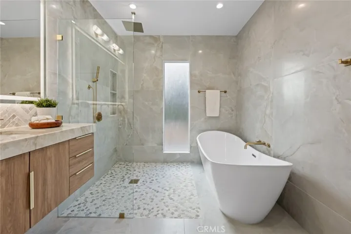 Step inside to soaring vaulted ceilings, sun-filled open living spaces, and a designer chef’s kitchen with a massive center island, oyster-shell ceramic backsplash, custom cabinetry, and premium stainless appliances. Natural light highlights the white-oak engineered floors, porcelain tile accents, and the stunning marble feature wall in the spa-inspired primary ensuite.