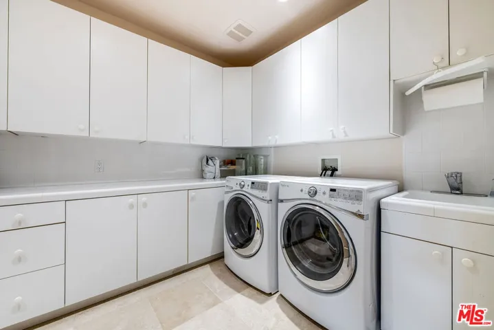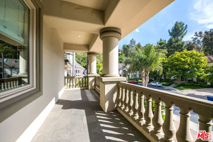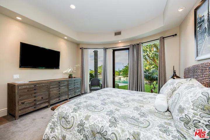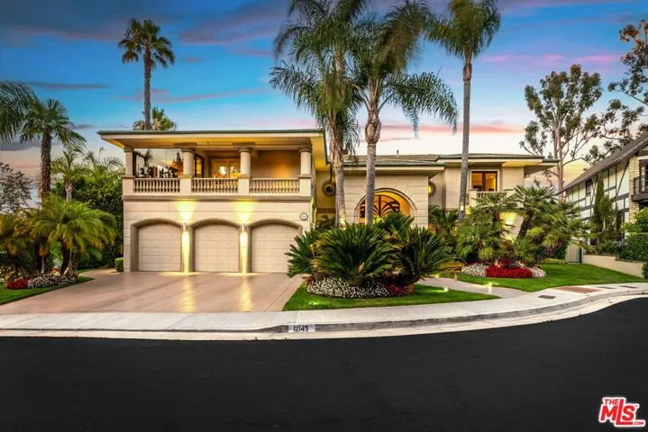 Nestled in the exclusive 24-hour guard-gated enclave of The Summit above Beverly Hills, the magnificent Contemporary Villa offers the ultimate in privacy, luxury, and serenity, all just minutes from the vibrant heart of Beverly Hills and Studio City. Situated atop a small knoll at the end of a peaceful cul-de-sac on a premier corner lot, the graceful estate features spectacular city, canyon, and mountain views, providing a sense of tranquility, charm, comfort, and privacy in one of Los Angeles’ most exclusive enclaves. This timeless estate spans just under 7,000 sq.ft. on an approx. 16,216 sq.ft. lot, perfectly blending modern luxury with classic architectural detail. A grand arched entry with intricate textured glass and palm frond sculpted iron double front doors open to a formal foyer with travertine floors and a sweeping curved staircase, setting the tone for the sophistication found throughout. The formal living room impresses with soaring two-story ceilings, a stately fireplace, built-in granite bar, and walls of arched windows and glass doors that flood the space with natural light and open to the backyard oasis. Every ceiling is sculptural. Heated floors in both the living room and gourmet kitchen add comfort and refinement. Art lovers will appreciate the abundant wall space and thoughtful niches throughout the home, perfect for displaying a curated collection. The large formal dining room features a long built-in buffet with cabinetry, and matching arched ceiling, ideal for elegant entertaining. The chef’s kitchen featuring two clear-span curved glass windows is equipped with professional-grade appliances, a large granite center island, and an adjoining breakfast room that seamlessly flows into the inviting family room. A powder room, guest bedroom and bathroom, media/screening room, and laundry room complete the lower level. Upstairs, two spacious guest or family bedrooms each offer ensuite baths, while the expansive primary suite is a true sanctuary, complete with private balconies overlooking breathtaking vistas, massive dual custom walk-in closets, and a marble-clad bath featuring dual vanities and commodes, a soaking tub, separate steam shower, and an adjoining gym. The resort-like backyard is an entertainer’s dream, with generous patio space surrounding the pool and spa, tropical-inspired landscaping, and grass area, all set against the dramatic backdrop of panoramic views. A three-car attached garage provides ample space for vehicles and storage. Offering an exceptional lifestyle in a secure, sought-after community, this remarkable estate embodies peaceful, private living with effortless access to all the best of Beverly Hills and beyond.