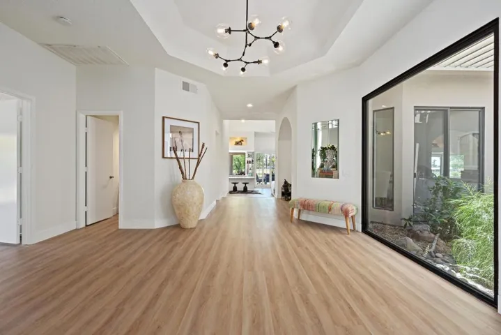 Tucked away on a quiet cul-de-sac overlooking the18th tee box of the coveted Nicklaus Private golf course inside PGA West. A private courtyard has been updated with pavered walkways and lush landscape. Outdoor spaces include a private, pebble finish pool with a tanning shelf and spa, multiple seating areas, built-in BBQ, island seating, built-in fire pit and electric awnings for additional shade.This area was designed for relaxation and fun offering golf course and mountain views,Upon entering the home you are met with a Desert Boho motif featuring new flooring, base boards, paint, soaring ceilings and a glassed-in atrium giving you a sense of bringing the outdoors to indoor living. Living room areas include a wet bar featuring refrigerator, ice maker and wine refrigerator. The fully stocked kitchen hosts new countertops, plenty of prep areas, new cabinetry, plenty of storage and open outdoor views.The spacious primary suite has an attached private bath with a free standing soak tub, new lighting, double vanity, new cabinetry and a large walk-in closet.Guest bedrooms are generous in size and each have their own private en-suite baths with ample closet space.This home comes with a multi-room sound system connecting through bluetooth for music throughout the home, is fully furnished and finely appointed.Two car attached garage with additional space for golf cart, ample additional parking for guests Everything is ready and waiting for you to come and enjoy.