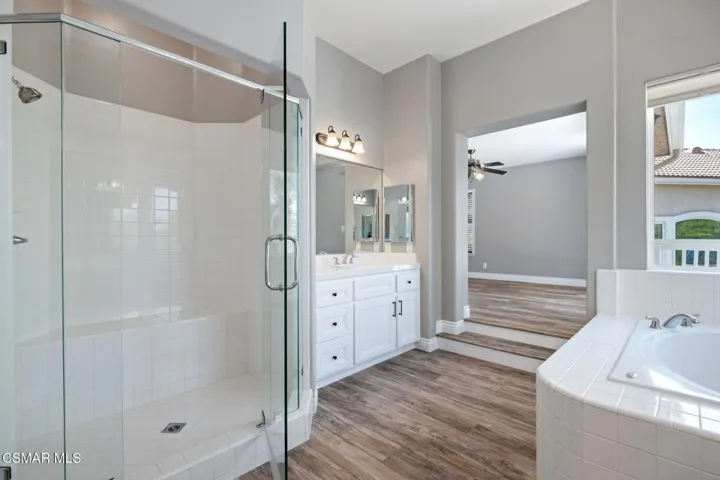 This beautifully upgraded Wood Ranch home offers 5 bedrooms, 4 bathrooms, and 3,639 sq ft of refined living space, along with a private backyard and seamless indoor-outdoor living designed for easy entertaining. Ideally located near trails, parks, golf, and much more, this residence combines comfort, elegance, and convenience. Step into a grand foyer with soaring ceilings and natural light that flows into the formal living and dining rooms–perfect for gatherings.The gourmet kitchen features Bosch appliances, a Sub-Zero freezer, granite counters, a center island with seating, and a walk-in pantry, opening to a warm family room with fireplace and custom built-ins. The main suite is a private retreat with its own fireplace, spacious walk-in closet, and a serene balcony. Just off the suite is a flexible bonus room–ideal as a home office, gym, nursery, or quiet reading space. The spa-inspired bath offers dual vanities, a soaking tub, and an oversized walk-in shower.Upstairs, apart from the main suite, there are three additional spacious bedrooms–one with an ensuite bathroom and two with access to a Jack-and-Jill bath. All upstairs bedrooms feature ceiling fans, generous closet space, and plenty of natural light. The home also offers dual-zoned A/C and plantation shutters throughout for style and comfort year-round.Out back, enjoy a newer built-in BBQ island with sink, fridge, stamped-concrete patio, a plunge spa with waterfall feature, and a comfortable seating area for relaxing or casual outdoor dining. Mature landscaping provides summer privacy, while winter reveals northern mountain views.The main level includes a well-appointed bedroom with an adjacent full bathroom–ideal for guests or multi-generational living–as well as a full laundry room with sink and storage. Elegant hardwood flooring runs throughout, and a spacious three-car garage offers built-in cabinetry for organized storage.This prime location is just minutes from Wood Ranch Golf Club for golf, dining, and social events, Rancho Madera Community Park with tennis courts, basketball courts, playgrounds, picnic areas, and open green space, the highly regarded Wood Ranch Elementary School, and the renowned Ronald Reagan Presidential Library. Residents also enjoy access to miles of scenic hiking and biking trails, a community pool and spa for relaxing and recreation, and the peace of mind of 24-hour security. A compelling blend of elegance, comfort, and the best of Wood Ranch living.