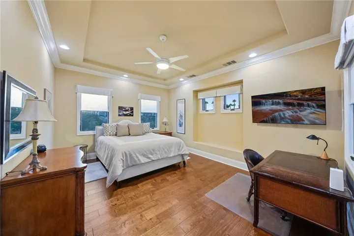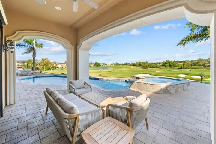 Welcome to this Exceptional custom home in Bear Creek boasting stunning views of the par five 11th hole and the signature par three 12th hole of the Jack Nicklaus designed golf course. This 6,028 sq. ft. estate showcases 4 bedrooms, 7 baths, an executive office with built ins, a huge loft/game room with wet bar and entertainment center, and an ADA compliant elevator. The grand entry welcomes you through double iron doors into a dramatic foyer with 25’ ceilings, leading to a magnificent living room with vaulted ceilings and a 6’ fireplace. The formal dining room features a climate controlled wine cellar with storage for 600 bottles, creating the perfect setting for elegant entertaining. The gourmet kitchen is designed for the culinary enthusiast with an enormous center island, SubZero refrigerator, 6-burner stove plus griddle, three ovens, two warming drawers, dual dishwashers, pot filler, microwave, double sinks, large walk in pantry, and butler’s pantry. The luxurious primary suite offers curved windows, soffit lighting, marble surfaces, travertine flooring, Jacuzzi tub, oversized shower with 10 shower heads, and an enormous custom closet with built-in shoe racks. Upstairs are two spacious ensuite bedrooms with large walk in closets, a sprawling game room with pool table and built ins, and a covered patio with fireplace overlooking the golf course. The private office features wood flooring, coffered ceiling, and built in desks and shelving. Resort style amenities include a Pebble Tec pool and spa with Ozone water filtration, outdoor kitchen, oversized 3 car garage with insulated doors, epoxy flooring, and abundant storage. Modern upgrades include surround sound, central vacuum, water softener, reverse osmosis system (HALO), custom window coverings with electric shades, electric outdoor screens, and high end finishes throughout including granite and onyx countertops and travertine flooring. Since ownership, the home has been extensively enhanced with new pavers in the front, back, and sides of the home including the driveway, fresh interior and exterior paint, landscaping in both the front and back with slope improvements facing the golf course, a wine cellar cooling system, 3 new HVAC systems with ductwork and clean air (HEPA) filtration, and a paid off 13.5 KWH solar system with 40+ panels and 5 storage batteries. With timeless design, modern efficiency, and some of the best views Bear Creek has to offer, this estate is truly one of a kind.