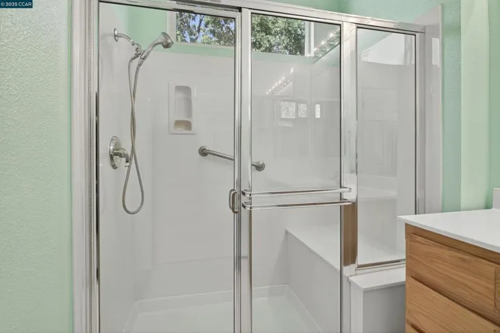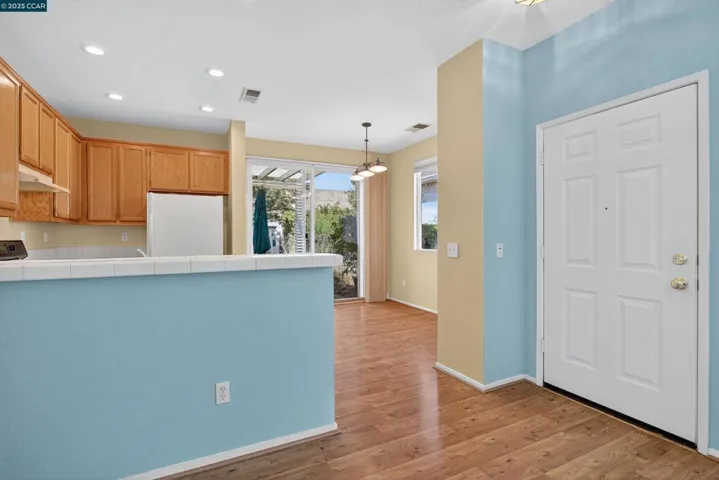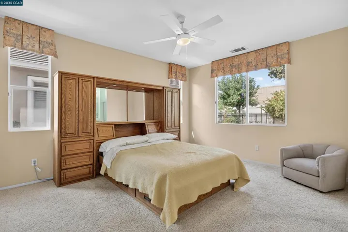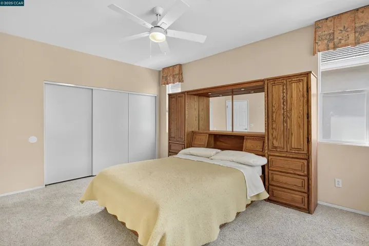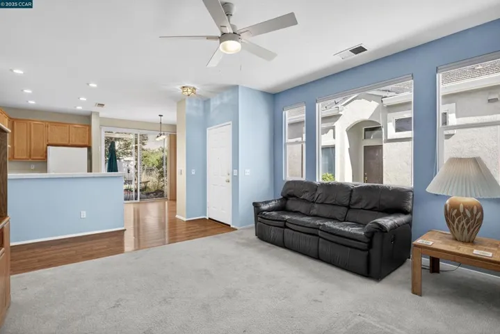 Discover comfort and convenience in this well-maintained 2-bedroom, 2-bathroom home offering 1,048 sq ft of living space. Located in a desirable gated senior community, this property features an open floor plan, an eat-in kitchen with classic tile countertops, and laminate flooring in the kitchen and hallway. Enjoy year-round comfort with central AC and heat, dual-paned windows, and newly installed ceiling fans in the living room and bedroom. The attached 2-car garage provides secure parking and extra storage. Relax or entertain in the backyard with a patio area and space for your own garden. This home is ideally located near the community pool and tennis courts, and just minutes from Brentwood Golf Club, local shopping, and freeway access.