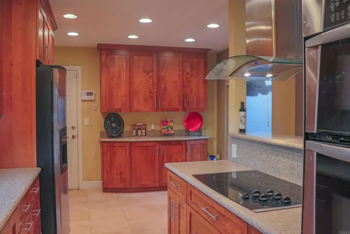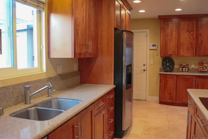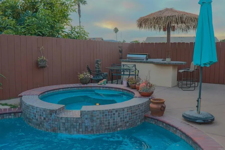 Incredible opportunity in the heart of Clairemont. From the moment you pull up you will see the pride of ownership and curb appeal. A large, fully fenced and gated front yard greets you. As you enter the front yard through the brick masonry and wrought iron gate you approach the front patio with café seating area and gardening bed. Once inside you will notice the extensive upgrades throughout. The kitchen has been remodeled with Alderwood cabinets, stainless steel appliances, and granite counter tops. The bathrooms have each been updated with an elegant feel. The three bedroom two bath home features include; tile shower surround, pebble floor, seamless glass shower, stainless hardware, 16 panel solar system, tankless water heater, soft water system, pool, spa (with new heater), swim jets and wireless operating system, built-in outdoor kitchen & refrigerator all covered by a thatched palapa. This is a must see property be the one to call this home.