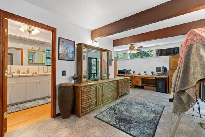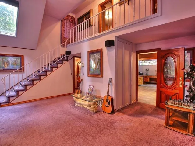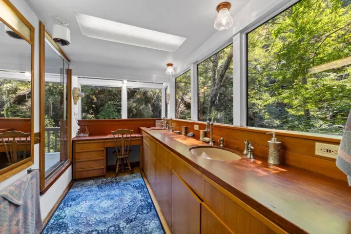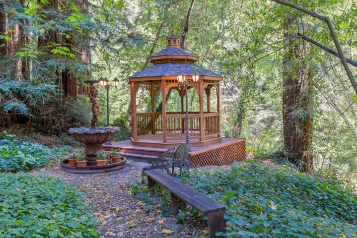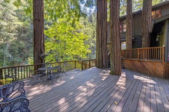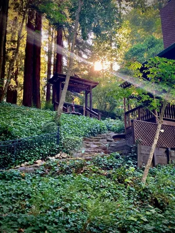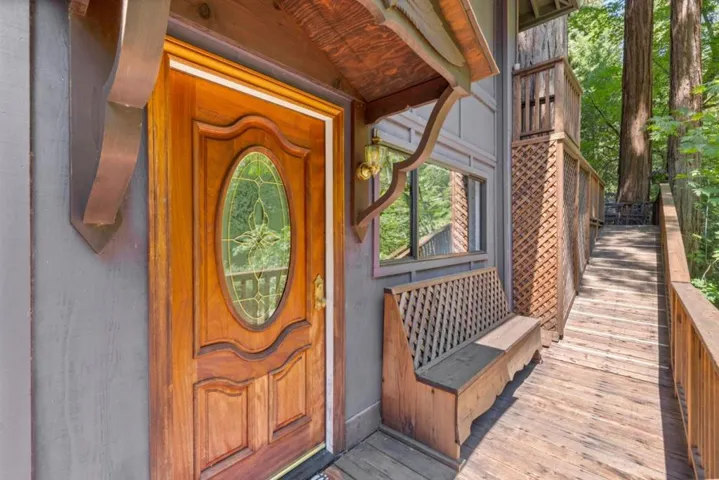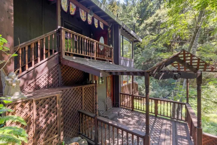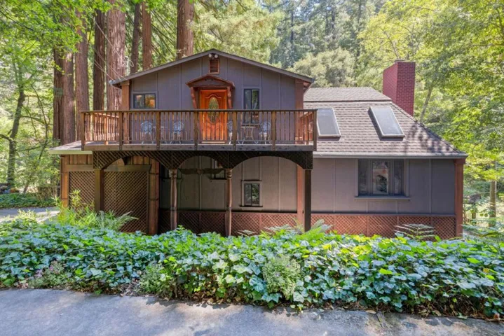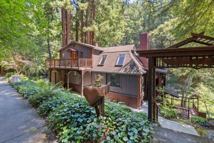 Welcome to Fairybrook. A Rare Riverfront Retreat With Your Own Private Beach! This waterfront bird lover’s paradise overlooks the San Lorenzo River flowing year round, with park benches, a gazebo, three garden statue fountains, and four decks nestled beneath a fairy circle of redwoods. A separate heated workshop adds versatility, while a natural gas back-up generator by Generac powers the entire property within ten seconds. The remodeled cottage features a seasonal waterfall view and custom woodwork throughout. Custom woodwork on the exterior includes a carved redwood remote gate entry system. Enjoy two romantic natural gas fireplaces and hearths designed with Bisazza tile. The living room and primary bedroom both feature hand-crafted, built-in entertainment center cabinets. The large kitchen and laundry room both include custom-designed sinks. The spacious dining room has large windows with a full river view. This home features seventeen elegant mahogany designer doors and five skylights that fill the home with natural light. Three ornate ceiling fans and an abundance of windows offer river views across all three stories. Your fantasy forever home, or the perfect bed and breakfast where every stay makes dreams come true.