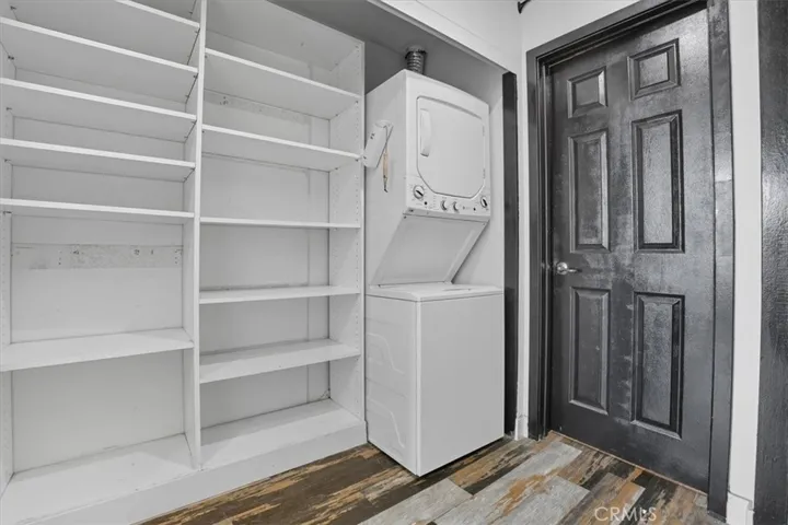 The interior features clean laminate flooring, a stylish kitchenette with black granite bar-style counters that double as a dining area, full-sized electric range, microwave, refrigerator and stacked washer/dryer. A walk-in shower, generous walk-in closet and additional storage keep everything streamlined and organized.