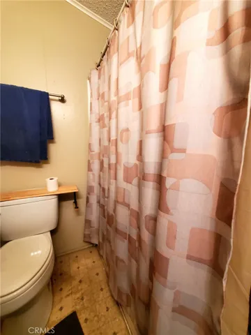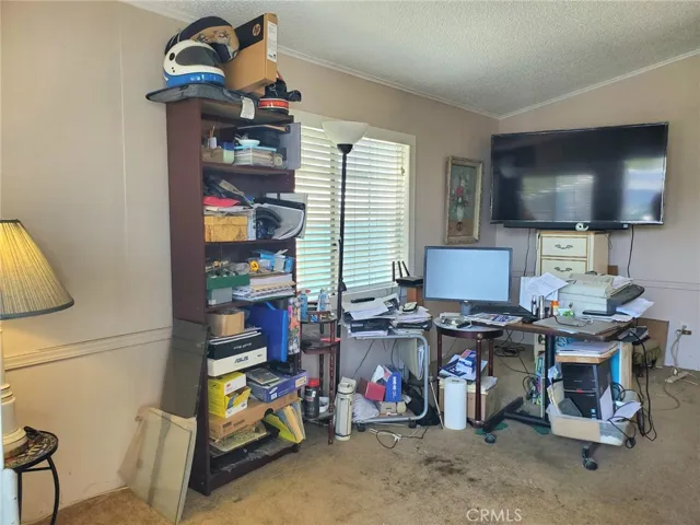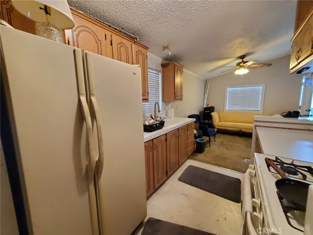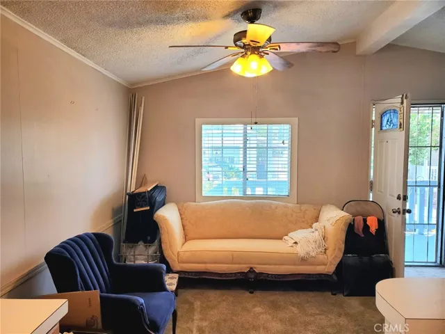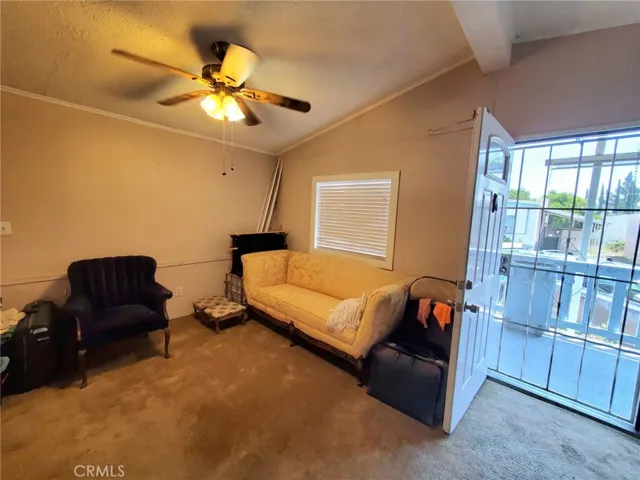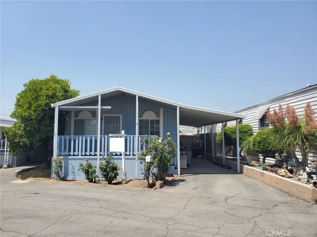 Welcome to this gated senior park with views of the mountains! This home is a large 3 bedroom 2 bath gem in a quiet park near the community pool, LOW space rent! Walk up to the large inviting front porch, where you have room for a bistro table and chairs. Once you enter, you are in a large living/dining room area with a ceiling fan, carpeting and is open to the kitchen. The kitchen is a galley kitchen, with a breakfast bar with seating for 3 people, and a closet with a full size washer and dryer. The primary bedroom is in the back of the house, has a large closet, carpeting and a ceiling fan and an attached private bathroom. The primary bathroom features a shower/tub combination, a large vanity and linoleum flooring. The other 2 bedrooms have carpeting, and ceiling fans. The main bathroom also features a shower/tub combination and linoleum flooring.