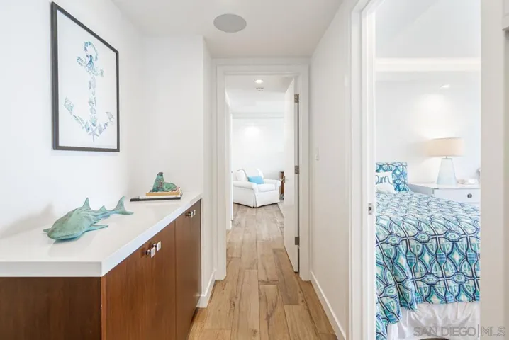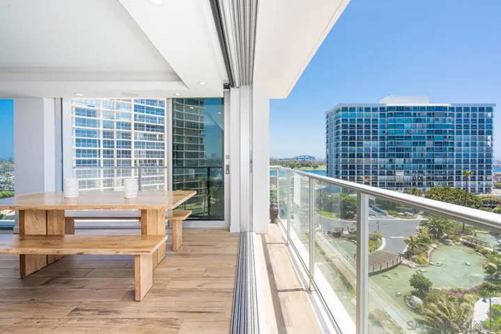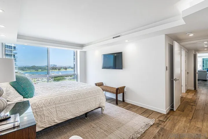 This corner unit is located on the 6th floor of Las Palmas Tower at the highly desirable Coronado Shores with views south to Mexico and across the bay to the Coronado Golf Course, Bay and Bridge. The spectacular arrangement of the sliding windows allows for an indoor/outdoor feeling as if you are perched right on the beach! Rise and shine to enjoy your coffee while watching the crashing ocean waves. A short stroll to the beach and beach club for sunset cocktails. This 3 bedroom, 3 bath unit has 2 primary bedroom suites with king beds and a third bedroom with 2 double beds. Gourment kitchen, designer quality furniture, luxury linens and 2 car garage parking space.