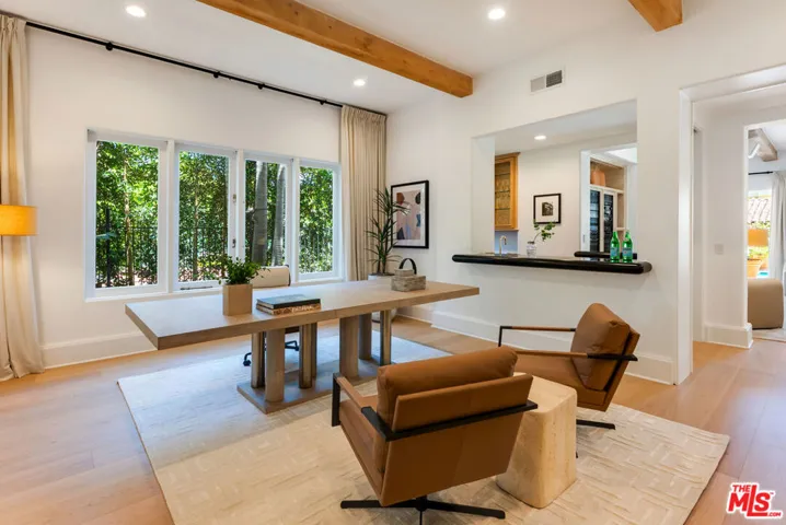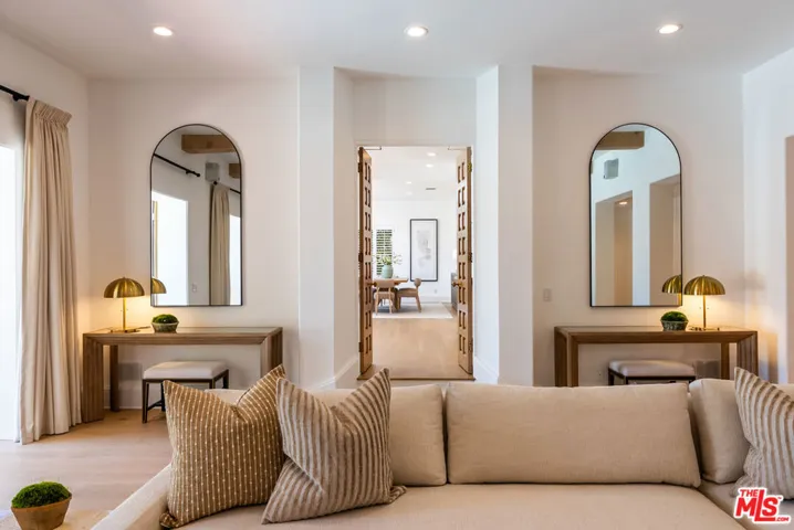 Presenting The Bedford Estate, a newly refreshed Mediterranean masterpiece in the coveted Flats of Beverly Hills. Gated and private, the striking white exterior with black trim is framed by a circular driveway, leading to an elegantly designed two-story residence of approximately 11,000 square feet on a half-acre of pristine grounds. A dramatic two-story foyer with a sweeping staircase introduces the formal living room, dining room, office, and an exceptional family room with floor-to-ceiling French doors that open seamlessly to the backyard. Wide-plank white oak floors, soaring ceilings, expansive windows, multiple fireplaces, and abundant natural light create a warm yet grand atmosphere. The chef’s kitchen is a culinary dream, featuring skylights, a large center island, and an expansive informal dining area that also opens to the outdoors. The backyard is a private oasis, offering multiple seating and lounging areas, an inviting pool, and a beautifully landscaped grassy yard. A separate pool house complete with a bath provides the perfect retreat or entertainment space. Upstairs, the primary suite is truly exceptional, showcasing vaulted beamed ceilings, floor-to-ceiling windows, a fireplace, and two luxurious spa-style bathrooms each with a seating area and boutique-sized closets. Three additional upstairs ensuite bedrooms offer generous proportions, high ceilings, and refined finishes. A service bedroom is conveniently located downstairs near the back staircase. Completing the estate are two attached garages plus two additional garages accessed from the alley. This is truly a one-of-a-kind home in a one-of-a-kind Beverly Hills location.