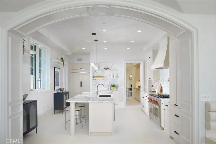 Exquisitely reimagined in 2025, this French palatial manor pairs timeless European elegance with fresh, modern sophistication. Set on a 13,155± sq. ft. parcel in the prestigious guard-gated enclave of Pelican Crest, the 8,367± sq. ft. residence commands sweeping views of the Pacific Ocean, Catalina Island, Newport Harbor, and the famed Pelican Hill Golf Course. Behind its stately façade, every detail has been elevated with the finest materials and craftsmanship: natural limestone and white oak herringbone floors, hand-brushed Venetian plaster, Moka Creme honed stone in all wet areas, and bespoke solid brass hardware in oil-rubbed bronze or polished nickel. The two-story foyer with antique chandelier leads to a grand staircase, gracious formal living and dining rooms with custom fireplaces, a richly appointed wood-paneled library, and a sun-filled family room with fireplace that adjoins the gourmet kitchen. A culinary showpiece, the kitchen featuring Calacatta Vagli marble surfaces, custom cabinetry, dual refrigerators, professional-grade appliance, and a built-in upholstered ocean-view banquette with custom breakfast table. The opulent primary suite offers a fireplace, spa-inspired bath with an ocean-view soaking tub, architectural glass-block accents for natural light, and a custom-designed closet. Additional amenities include five secondary suites, a tiered theater room, activity/fitness spaces, sauna, steam room, and a subterranean 7-car garage. Additional upgrades include a new roof, new HVAC system, all new plumbing connectors and two new water heaters. Outdoors, new stucco and roofing frame lush entertaining areas with a saltwater pool/spa and BBQ/kitchen with natural stone countertops — all set against a backdrop of endless coastal beauty. This is Newport Coast living at its most refined — where architectural artistry meets modern luxury in a rare, view-rich estate.