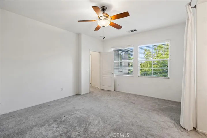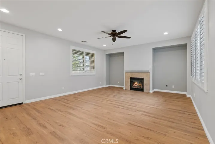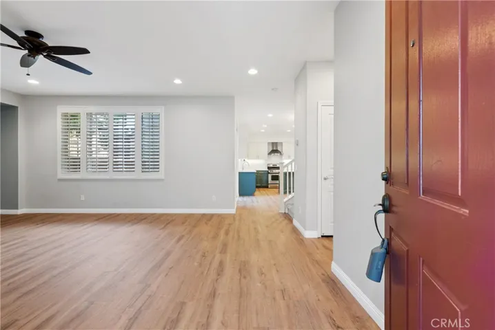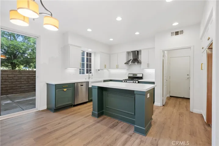 Beautifully maintained and updated Valencia Creekside townhome—featuring the largest floor plan in the community and one of the few with a downstairs 4th bedroom and bathroom! Offering 4 bedrooms, 3 bathrooms, a 2-car garage, and a spacious private patio, this home has been freshly updated with new interior paint throughout the living space. A lush front yard and welcoming covered porch into a bright, open living room complete with a ceiling fan, cozy fireplace and plantation shutters. The thoughtful layout includes a downstairs bedroom and ¾ bath—perfect for guests, multigenerational living, or a private home office. The living space flows seamlessly into the dining area and open kitchen. A newly updated kitchen is a true showpiece, blending modern design with everyday functionality. Bright and airy with recessed lighting, it features a large center island with crisp white quartz countertops, perfect for meal prep or casual dining. The two-tone cabinetry offers a stylish contrast—deep green lower cabinets accented with sleek gold hardware, paired with clean white upper cabinets for a timeless look. A farmhouse-style apron sink sits beneath a sunlit window, complemented by a designer hexagon tile backsplash that adds a subtle touch of elegance. The kitchen is complete with stainless steel appliances, including a gas range and dishwasher, as well as ample cabinet and drawer storage. A sliding glass door off the kitchen opens to a large private patio with a natural gas BBQ hookup and planter area—ideal for entertaining or relaxing outdoors. Upstairs, you’ll find three more generously sized bedrooms and two full baths. Each bedroom is appointed with neutral-colored carpeting. The hallway bath offers a dual-sink vanity, while the spacious primary suite features a large walk-in closet and a spa-like bathroom with dual vanities, a soaking tub, walk-in shower, and even its own ceiling fan for added comfort. Residents of Creekside enjoy resort-style amenities including two pools and spas, a clubhouse, barbecues, scenic paseos, security patrol, and beautifully landscaped greenbelts. Best of all, this home has NO Mello-Roos and is ideally located near Valencia Heritage Park, award-winning schools, shopping, dining, and more. Don’t miss this rare opportunity to own one of Creekside’s most desirable homes!