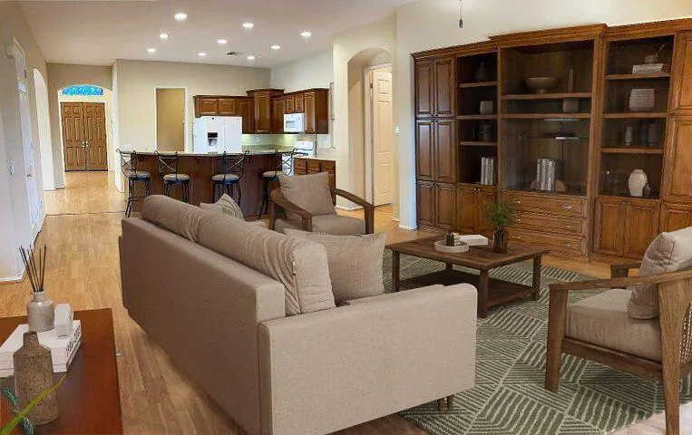 REDUCED PRICE. A beautiful home in Indian Palms Country Club. GOLF COURSE UNDER NEW MANAGMENT! This home is an RV’ers or Car Enthusiast’s delight. Extra long driveway, a separate insulated 2 car garage and insulated 48′ Garage with all the hookups. An added plus is both garages have air conditioning. This home has an open floorplan with Luxury laminate wood flooring throughout. The living/dining room flows into the kitchen and family room. Family room has built-in media center. Primary bedroom is separated from guest bedrooms and has a custom closet. Off the primary bedroom is a gated courtyard and Aluma-wood patio cover. Plus an unobstructed front yard view of the mountains. One of the guest bedrooms is being used as an office. The backyard is a spectacular oasis which includes a pool and spa, putting green and grape arbor. The patio has a built-in bar-b-q and TV for great relaxation and entertaining. Unique for this neighborhood this home sits on over a 9000 sq lot. HOA’s includes the lifestyle center membership and front and backyard upkeep. This home offers it all and is a must see! Some virtual pictures included
