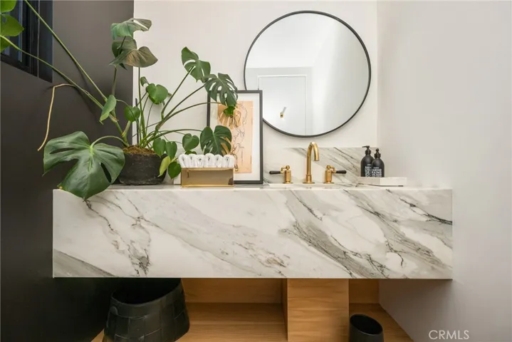 The entry level opens to a beautifully designed courtyard with Pet-turf and collapsing glass doors, a bedroom with an en-suite Nero Marquina marble bath, a beautifully appointed Calacatta Viola marble full guest bathroom with walk-in shower, a laundry room, and direct access to the three-car garage with epoxy-coated floors.