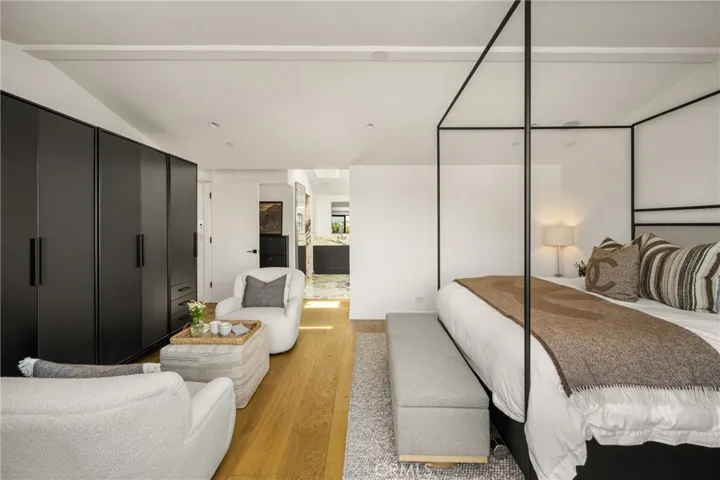 The third level is dedicated to the primary suite—a private retreat with sliding glass doors that open to a balcony, a wet bar, spa-inspired master bath wrapped in Arabescato marble, and a custom walk-in closet with abundant tailored storage.