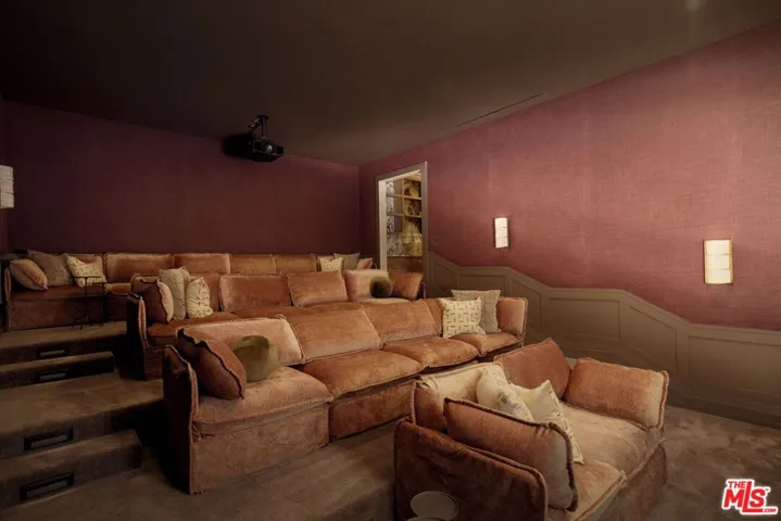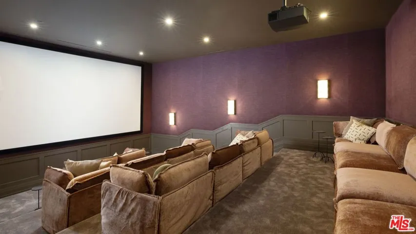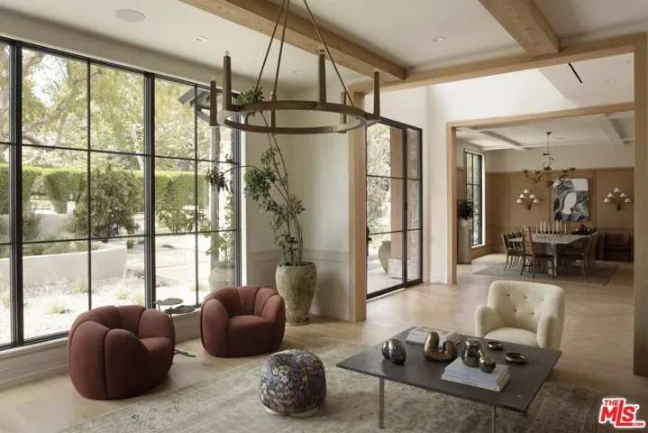 Mediterranean charm meets refined European elegance in this brand-new construction, 6-bedroom plus office, 9-bath, 10,100 sq ft residence set on a 14,143 sq ft corner lot. Heritage olive trees, vintage ceramic pots, and lush Mediterranean-inspired gardens frame a tumbled natural stone facade accented with fire-rated Acre siding that blends durability with timeless appeal. Step inside to discover interiors that celebrate artisanal craftsmanship and understated luxury. Solid white oak floors flow seamlessly throughout, complemented by intricate custom wood moldings and millwork that bring depth and warmth to every room. A curated selection of handpicked designer finishes lends effortless sophistication. The chef’s kitchen features custom marble countertops sourced and designed with inspiration from classic French ateliers, paired with European checkered flooring that continues into the hidden butler’s pantry. Formal living and dining rooms, a family room, and multiple entertaining spaces connect effortlessly to the resort-style backyard. Outdoors, a shimmering pool and spa with checkered stone waterline tiles set the tone for a luxurious living experience. An outdoor kitchen featuring an Alfresco pizza oven, a sculptural fire pit, and multiple terraces with panoramic canyon views extends the living space beyond the interior. The primary suite offers a tranquil escape beneath vaulted white oak ceilings, complete with dual walk-in closets, a private morning bar, and a spa-like bath featuring Waterworks fixtures and a Hydro Systems soaking tub . Additional amenities include a moody speakeasy bar, a 1,657-bottle refrigerated wine room, a state-of-the-art theater, and a wellness wing with a gym, cold plunge, sauna, steam room, and private massage room.