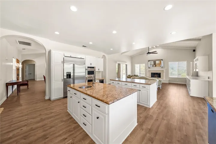 The gourmet kitchen offers double granite islands, Profession Chef’s appliances equipped with built-in Thermador and GE Monogram stainless appliances, huge walk-in pantry, separate breakfast nook with views, and is open to the Family Room with vaulted ceilings and fireplace. The Handmade tumbled marble mural backsplash and cast stone moldings accentuate the vineyard theme!