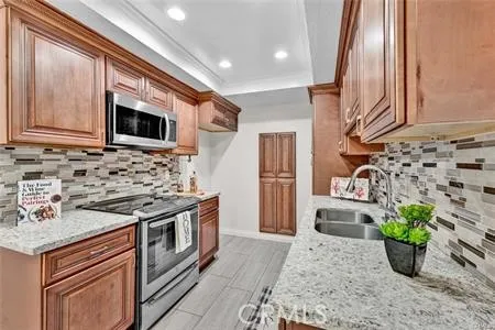 Charming and well-maintained upper-level 2-bedroom, 2-bathroom condo in the tranquil Pheasant Creek Community. This inviting living area features vaulted ceilings, tile flooring throughout, ceiling fans, recessed lighting, and direct access to a private balcony with a washer and dryer room, creating a bright and airy living space. The spacious primary suite includes two large closets, while the secondary bedroom also offers generous storage. The updated kitchen is appointed with granite countertops, recessed lighting, and tile flooring. This Condo has assigned one carport and one open space. Community amenities include multiple pools and spas, a picnic area, tennis and sports courts, and access to nearby walking and hiking trails. HOA dues cover water, trash, and exterior maintenance. Ideally located close to Saddleback Church, shopping center, parks, schools, and major commuter routes.