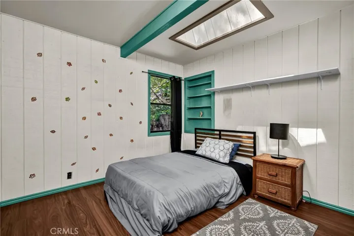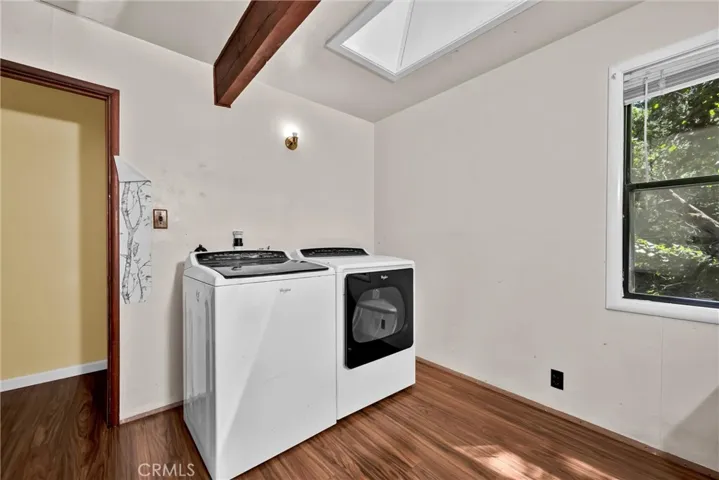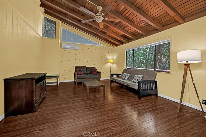 Built in 1962, the 1,120 square foot home welcomes you with warm wood finishes, vaulted ceilings, and large windows that frame tranquil forest views. The open living room feels inviting with its wood-burning stove, while skylights bring in abundant natural light and mini-split units provide modern heating and cooling. The kitchen includes an electric range, refrigerator, and deep sink, flowing into a dining area accented with knotty pine walls. A laundry area is conveniently located within one of the bedrooms, and attic access provides extra storage.