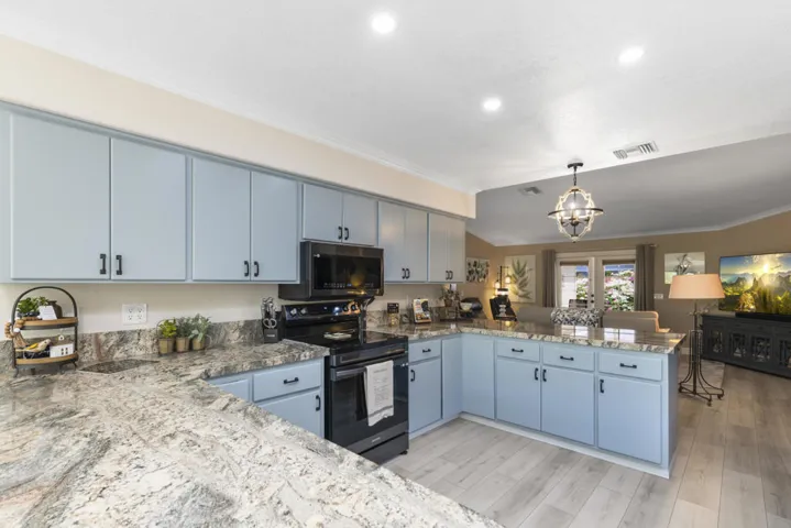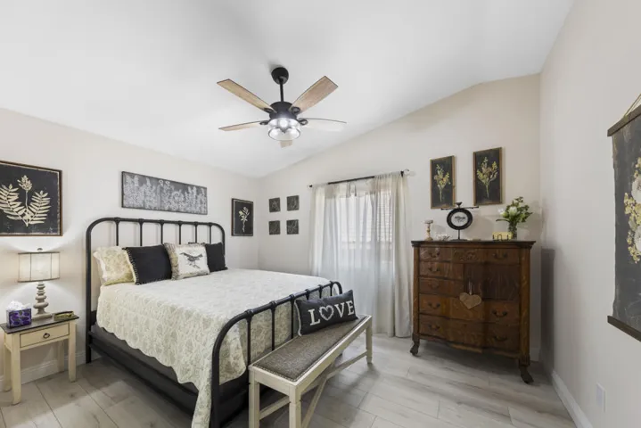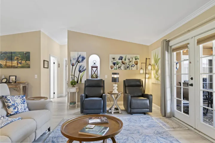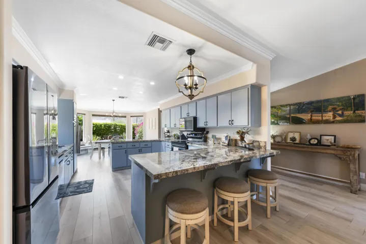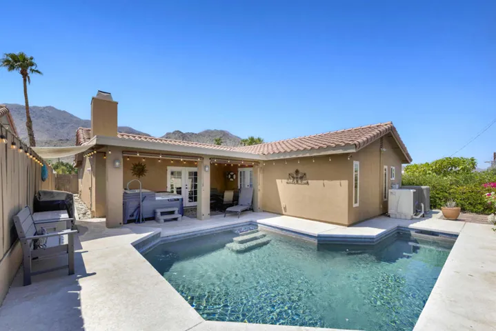 Classic La Quinta large SALTWATER PEBBLE TECH POOL/SPA HOME located on a level lot at The Top of the La Quinta Cove and just across the street from the popular Bear Creek Trail, plus all in a quiet, scenic neighborhood! Enjoy absolutely stunning panoramic mountain views from your desert front landscaped garden with lush privacy. As you enter this lovely home, the wide foyer with vaulted ceilings leads you to the great room which opens thru French doors to a spacious outdoor covered patio with barbeque, table and chairs surrounded with evening night lights around the ‘L shaped pool’. The large and bright kitchen with mountain views has granite counters, skylight and everything a cook needs to get the job done. The adjacent formal dining area also has panoramic mountain views and is perfect for watching beautiful desert sunsets. Guest bedrooms, master bedroom and master bath have upgraded new windows. Master bedroom has a walk-in closet and French doors that open to the patio, saltwater pool and spa. Many recent upgrades include: AC and heating unit, spa, newly installed flooring with baseboard and crowns mouldings throughout home, both bathrooms vanities, mirrors, counters, hardware and lighting is new. Custom window coverings that include black out shades, in bedrooms, blinds and drapes, recently painted exterior and interior of home including kitchen cabinets, all new doors, epoxy garage floor and cabinets, new kitchen and laundry appliances, cabinet in laundry, refurbished bedroom sliding door closets, home security system, electric pool heat pump, rear cedar fence, large jumbo television, lamps, decorative items, fans, pictures, linens in bath, bedrooms, kitchen and FURNISHED PER INVENTORY plus more !! Just a few minutes away is charming Old Town La Quinta with a feeling of community with art shows, Sunday Farmers Market, shops with various services, many great restaurants, post office, amazing library, senior citizen center, two wellness center-gyms, museum, baseball fields, park with public swimming pool, tennis and pickle ball courts, children’s play areas and City Hall with beautiful lake and park. Close by is Silver Rock Golf Course that has golf for residents and summertime concerts. Home is in move in turn key condition and ready for you to start making memories! Please inquire with listing agent for more detailed information, showings and our weekly OPEN HOUSES…call and make it your La Quinta Desert Retreat today!