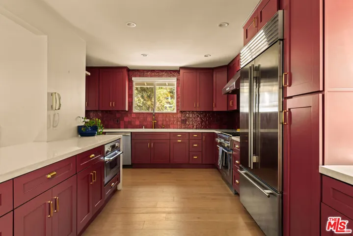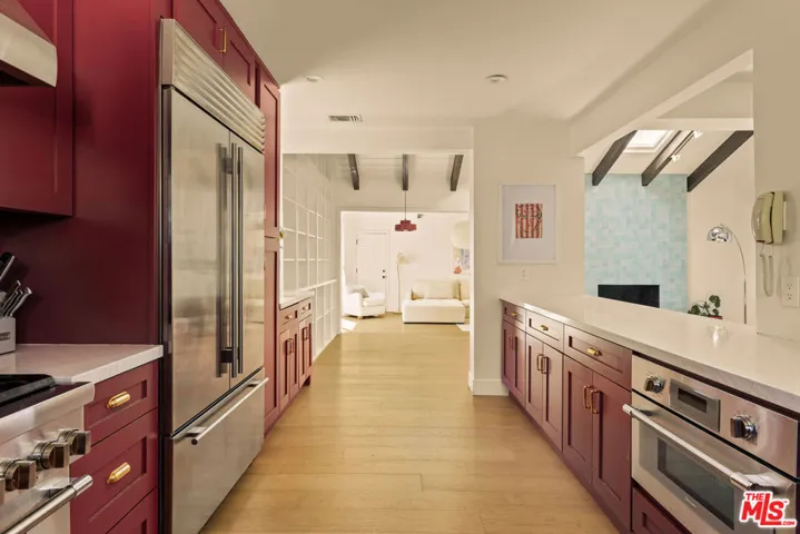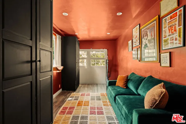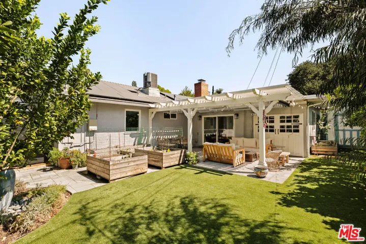 Set behind a gated entry, 4841 Don Pio Dr is a thoughtfully designed and well-maintained home that offers the perfect blend of privacy and style in the heart of Woodland Hills. This beautifully updated 3-bedroom, 2-bath residence features an open-concept layout with exposed beams, skylights, and abundant natural light throughout. The newly renovated kitchen boasts top-of-the-line stainless steel appliances, ample cabinetry, and a vibrant tile backsplash. In the living room, a striking teal-tiled fireplace serves as a bold centerpiece, seamlessly connecting to the dining area framed by floor-to-ceiling bookshelves. A secondary living room with double exposure opens directly to the backyard. The spacious primary suite includes an en-suite bathroom, while two additional bedrooms offer flexibility. Plus, the home includes a versatile bonus room that is ideal for a home office, studio, or gym. Outside, enjoy a covered patio with turf, a relaxing sauna, mature citrus trees, and flourishing garden beds. Located near Ventura Blvd and The Commons at Calabasas, this home combines serene living with unbeatable convenience.