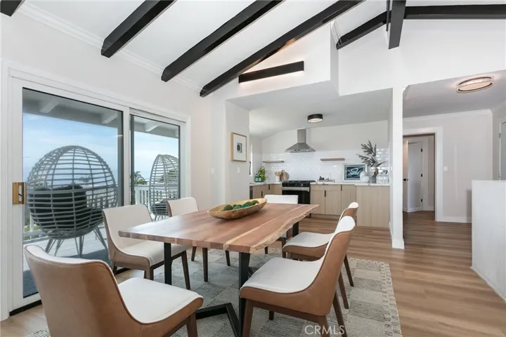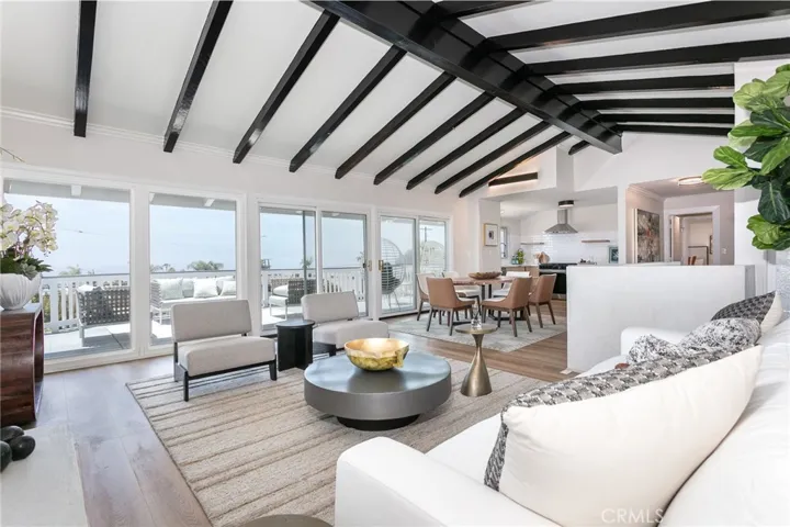 Recent upgrades include fresh interior and exterior paint, luxury vinyl plank flooring, modern lighting, central A/C, and full copper repipe. The living room features vaulted ceilings with exposed beams, large windows for natural light, and a fireplace. Sliding doors open to a balcony with peek-a-boo ocean views and stunning sunset skies.