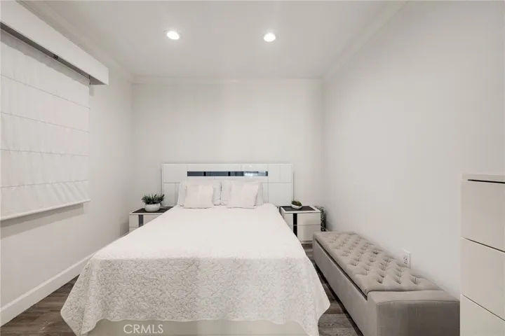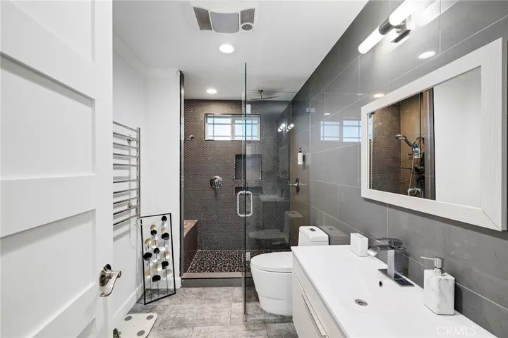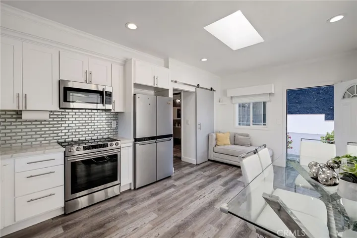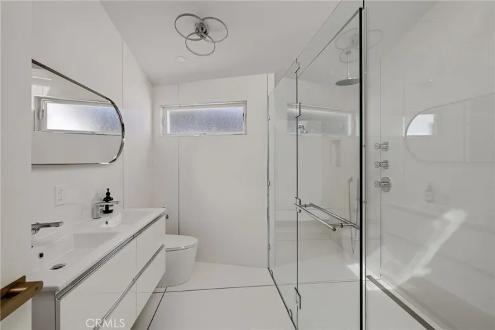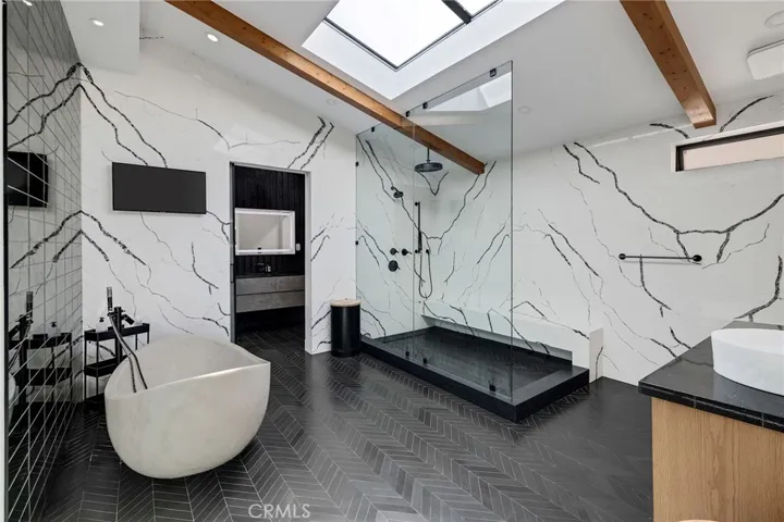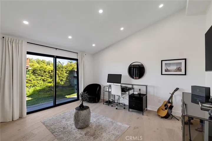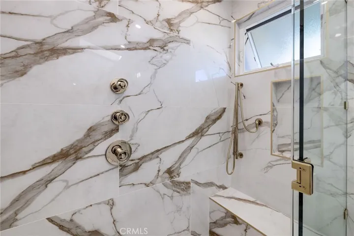 Enjoy the Long Beach skyline and LA Harbor as you enter through the oversized glass pivot door into an open floor plan designed for living and entertaining. The chef’s kitchen features black-and-white Dalmatian marble, Rohl fixtures, a large island and a suite of Viking appliances: 6-burner range, double ovens, counter-depth refrigerator and dual dishwashers. Wide-plank hardwood runs throughout; floor-to-ceiling sliders and bifold doors connect the interior with the backyard. A two-way glass fireplace anchors the great room; motorized curtains, recessed LED lighting and built-in AV are integrated.