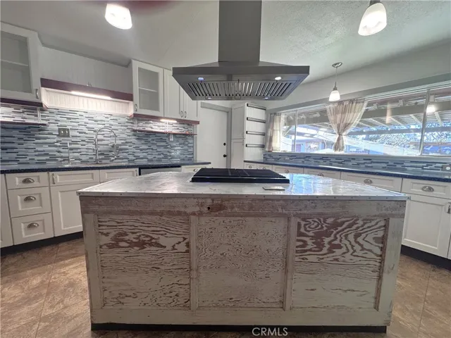 The kitchen is the centerpiece of the home, offering a central island, extensive cabinet space, a modern backsplash, and stainless steel appliances. A walk-in pantry provides exceptional storage, making meal preparation and organization effortless. Multiple living and dining areas flow together with bright natural light, updated flooring, and ceiling fans for year-round comfort.