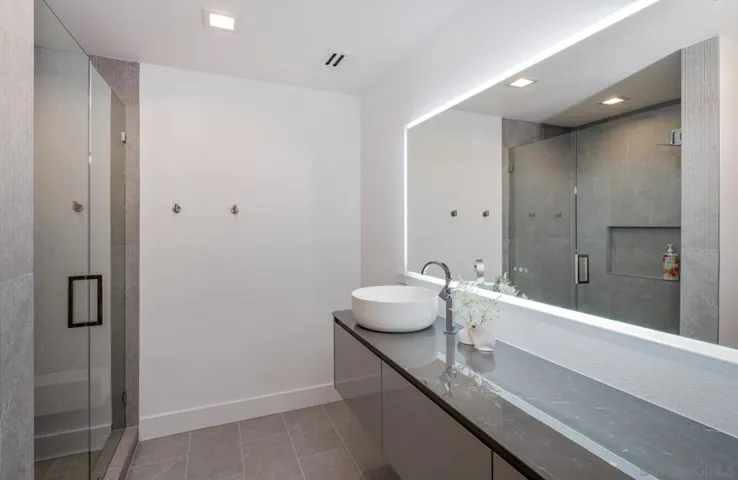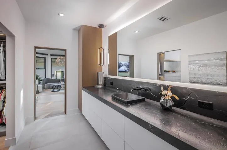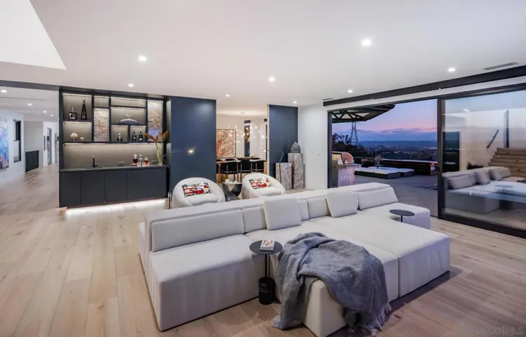 This hilltop home in Carlsbad, California, has been transformed into a breathtaking modern sanctuary. Set on a one-acre lot with sweeping views of the Carlsbad lagoon and Pacific Ocean, the property underwent a comprehensive remodel that blends contemporary elegance with purposeful functionality. Inside, the home features a mix of bespoke elements—from custom sofas and a liquid metal-finished fireplace to thoughtfully curated artwork that highlights local talent. Clever design choices, like a hidden pantry door and a discreet cooking station, bring both practicality and charm to the kitchen. The primary bathroom includes a spa-like wet area, creating a private escape within the home. Outdoors, an infinity-edge pool appears to flow directly into the ocean, while the beautifully landscaped grounds offer a peaceful setting for both relaxation and entertaining. This reimagined residence captures the essence of modern California living, where elevated design meets timeless comfort.