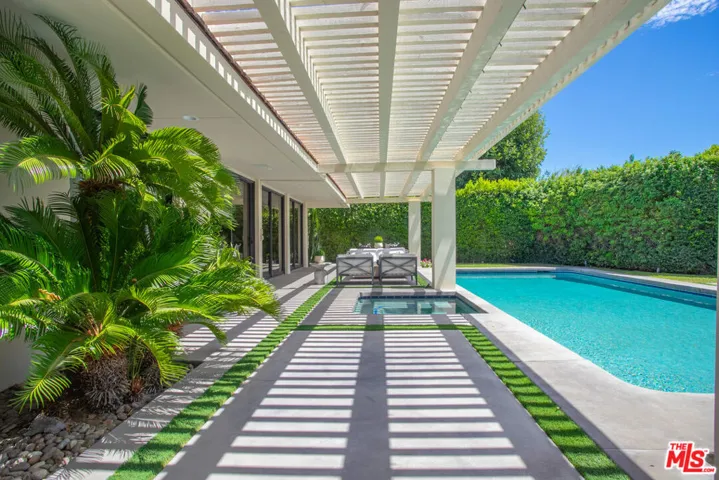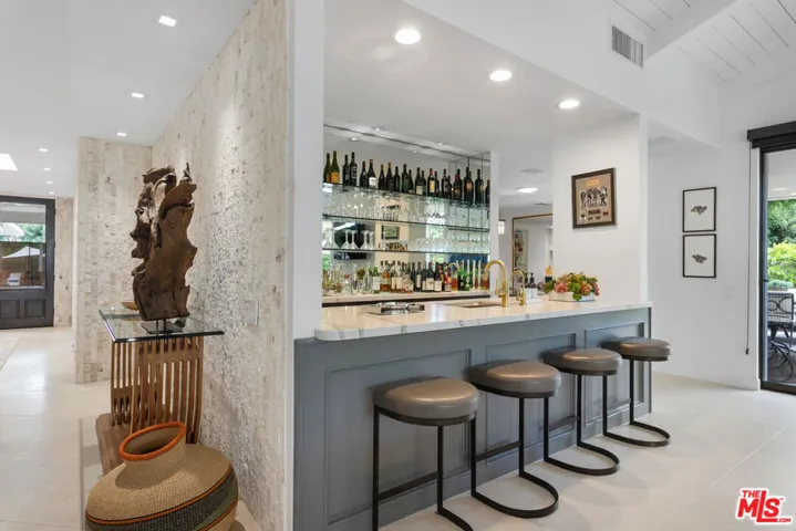 Here is your move-in-ready, chic contemporary retreat in the heart of Rancho Mirage! Set within the prestigious Morningside Country Club community with 24/7 guard-gated access, this sophisticated sanctuary offers nearly 3,300 square feet of spacious, light-filled living. Designed for effortless entertaining, the home features soaring vaulted wood-beamed ceilings in the living room and an open, airy layout. The dramatic entry showcases split-face stacked stone walls that open into the spacious living area, framing stunning views of the backyard. A striking fireplace, diagonally laid limestone flooring, and smooth stucco finishes throughout the interior create a cohesive, elegant atmosphere. A generous wet bar in the living area is perfect for hosting guests. The sleek, fully updated kitchen impresses with marble and brass accents, high-end appliances, and stunning custom cabinetry ideal for both cooking and gathering. This stylish residence offers three spacious and well-separated bedrooms, each with its own en-suite bathroom, providing comfort and privacy for you and your guests. The expansive primary suite includes a separate office area, perfect for working from home or as a private retreat. Step outside to your south-facing backyard oasis, where ultimate privacy meets resort-style living. Towering “Hollywood Height” Ficus trees create a lush green wall, ensuring seclusion as you relax in the sparkling pool and spa with new plaster and waterline tile, concrete decking, and a misting system to cool off on warm days. Additional highlights include a two-car plus golf cart garage with gorgeous garage doors that elevate the home’s curb appeal, as well as a circular driveway offering ample parking. The exterior remodel by Team Sun Builders featuring new smooth stucco enhances the modern Mediterranean aesthetic and further boosts the home’s striking street presence. Most furnishings are available outside of escrow, making for an easy, turnkey transition. Ideally located near premier shopping, dining, and entertainment, this exceptional home offers the perfect blend of style, comfort, and convenience.