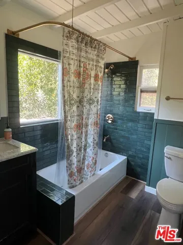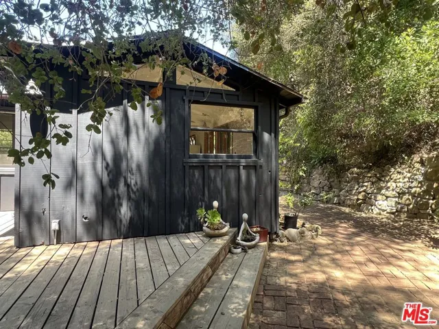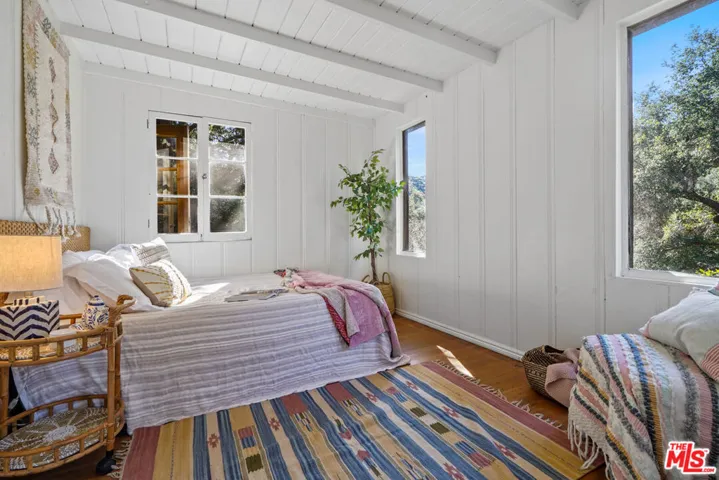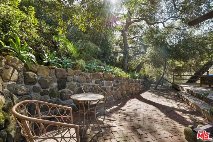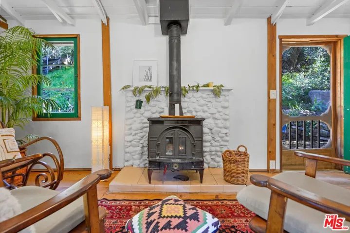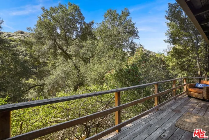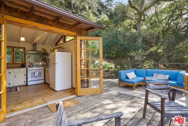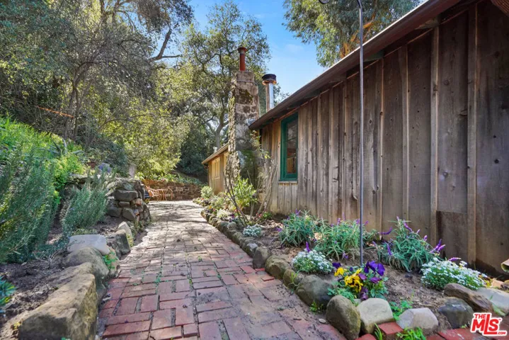 Enchanted Oak Crest! Mimi and Henry Smith’s legendary artist home on nearly 2 lush acres has been given new life by the new owners, and now the charm filled main house is ready to welcome new dreamers to take up the life of this mountainside homestead, surrounded by epic views to the west of the “7 Sisters” mountain peaks, including Strawberry Peak, which are protected parkland. The property backs up to parkland, as well, ensuring privacy. Henry and Mimi bought the property in 1960 from the original Homesteaders. They became stewards of this living work of art, building up and out as their needs changed over the years. Artists, musicians, actors, and writers dwelt, and played, on the Oak graced land. Units have been continuously rented since the 1960s, often by famous artists and musicians, all inspired by the pristine land. Up a romantic stone staircase the 2 bed, 1 bath 1934 main house perches with panoramic views of the cluster of peaks across the canyon. Sunlight floods the pine floors, beamed ceilings, and old cedar walls. A woodstove cozies up the rooms. Doors flung open welcome the soft breezes. The kitchen and bath have been updated and new minisplits bring a new level of comfort. Decks take in the views and the sounds of the nearby creek. Stone walls grace old stone patios. Fruit trees give their bounty, herbs and flowers scent the air. Plant tomatoes, and veggies. Or visit Topanga’s lovely farmers market. This epic home rests close to the village, the coast, the valley. Here on the mountain, the sounds of music, laughter and birdsong await your passion for the true Topanga Life.