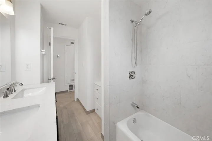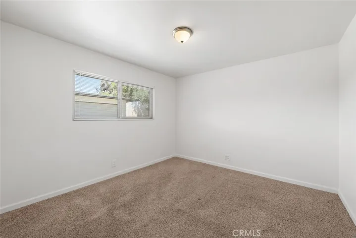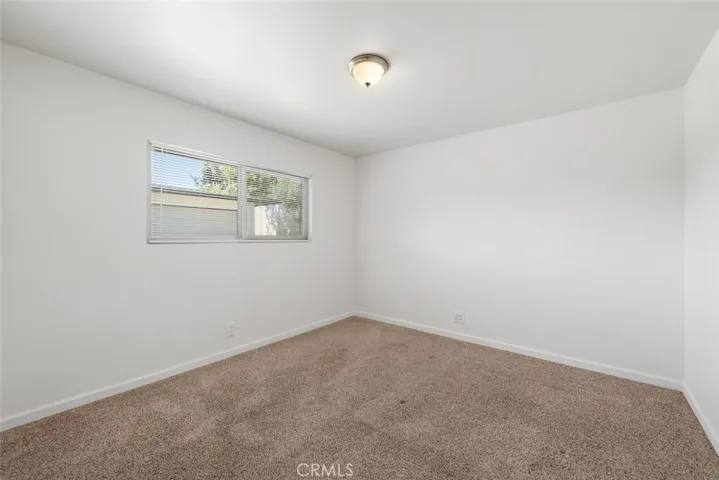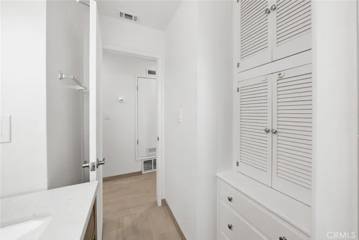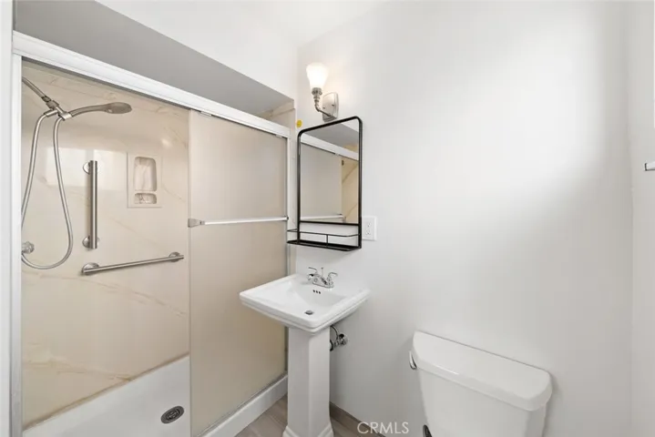 The primary suite includes cozy carpeting, an ensuite bath with a walk-in shower, and a classic pedestal sink. Two additional bedrooms, a well-appointed full bathroom with a dual-sink vanity and built-in linen storage, and inside laundry hookups provide added practicality.