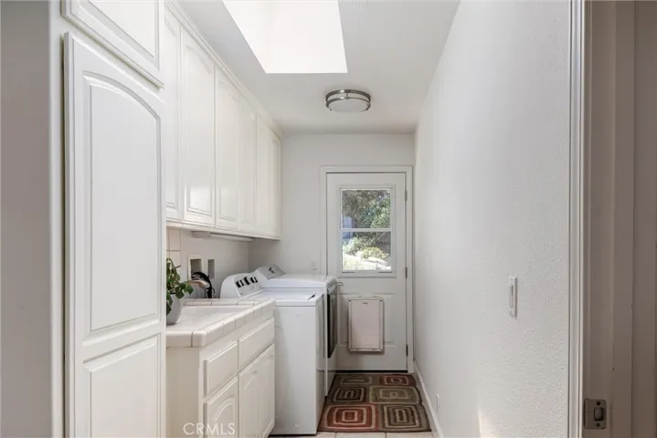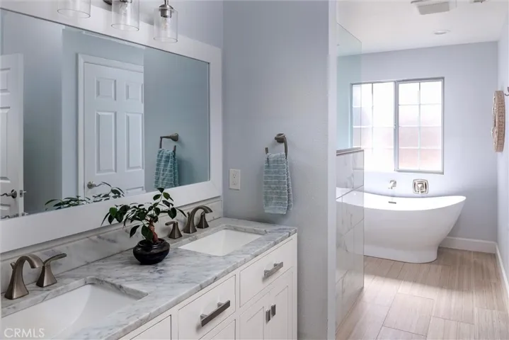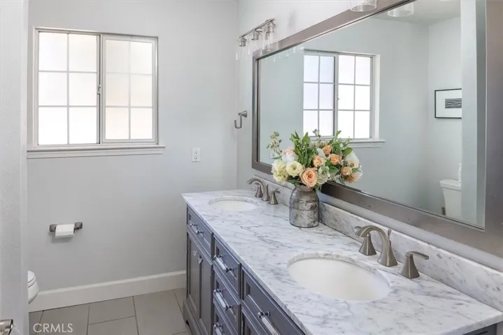 The private primary suite offers a spacious retreat, featuring a walk-in closet and a fully updated en suite bathroom with a soaking tub, walk-in shower, and dual-sink vanity with modern finishes. Two additional bedrooms include bay windows and large closets, while the updated hall bathroom features a tub-shower combination and new dual-sink vanity with a gorgeous countertop. A conveniently located half bath sits just off the kitchen, and a separate laundry room offers direct access to the backyard and garage.