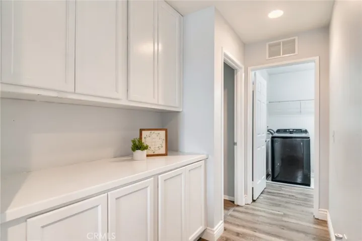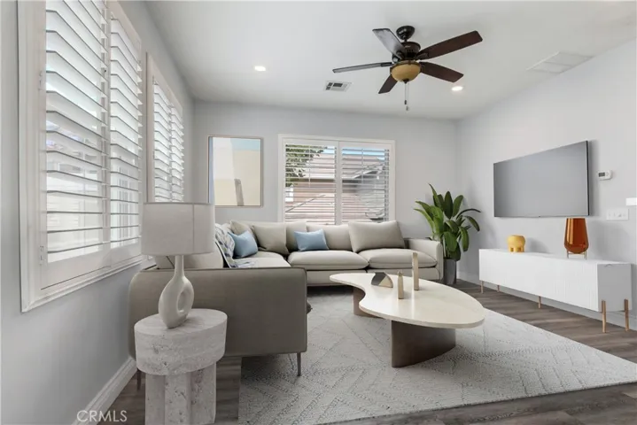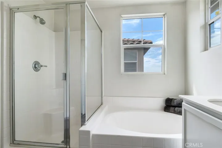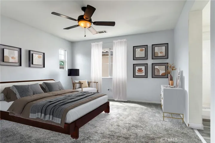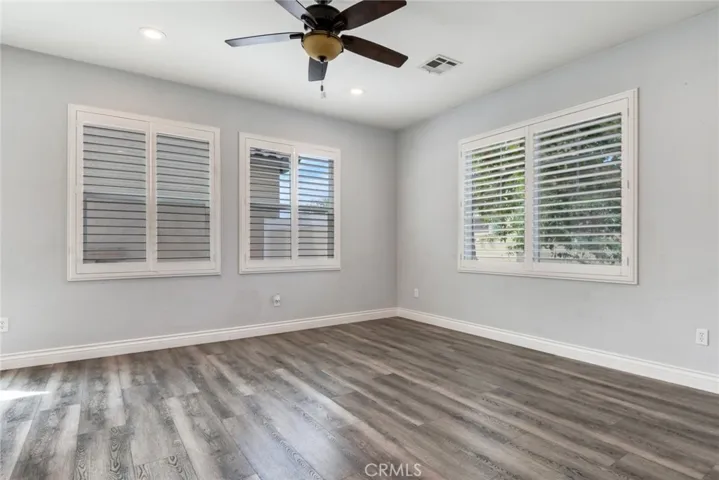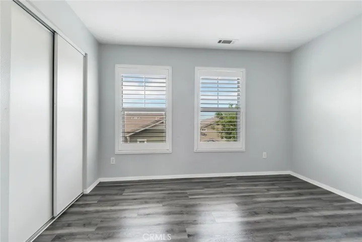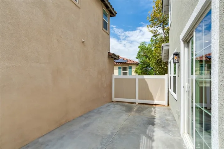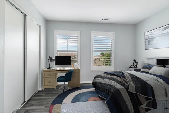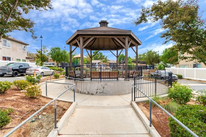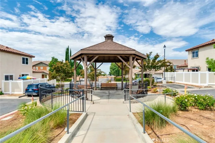 Welcome to Iris Gardens. This gated community caters to the active life style, with a pool/spa, a gym, playground, front yard maintenance and more. This 3 bedroom, 2.5 bath home is nicely upgraded with laminate floors, plantation shutters and quartz countertops. The kitchen is open to the family room with a breakfast bar and eating area. The living room off of the entry can be also be a formal dining room. The bedrooms are all good size with the primary boasting a walk-in closet and a spa type bath with soaking tub and separate shower. The two secondary bedrooms have direct access to the bath and the laundry is upstairs for great convenience. A private patio with privacy fencing allows for outdoor entertaining and the two car garage is attached. A pretty home indeed!