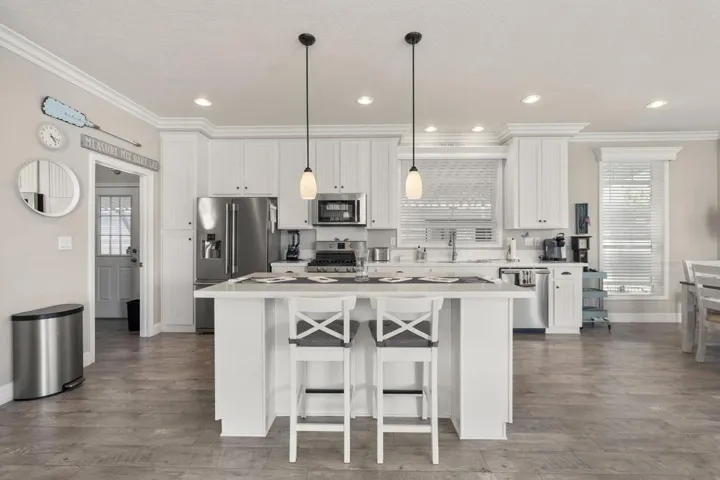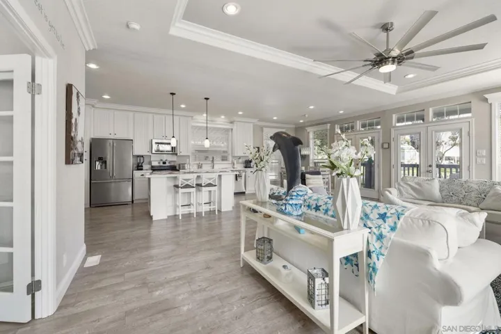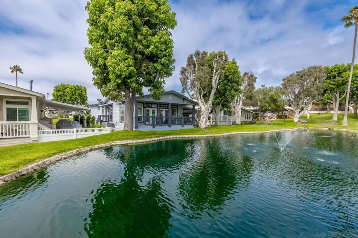 Welcome to paradise with a stunning lake and greenbelt view! Built in 2016, this is a beautifully maintained three bedroom, two bath manufactured home located in the highly desirable 55+ gated community of Lakeshore Gardens in Carlsbad. A meticulous masterpiece featuring a panoramic view of the greenbelt and lake with a full-length deck across the rear of the home. Furnishings throughout are included with the sale! Expansive dual pane windows and double patio doors filling the living and kitchen with natural light. Bright and open floor plan with vaulted ceilings. Spacious open living and dining areas flow into a well-designed kitchen featuring stainless steel appliances, plenty of cabinetry and counter space with an extended island for all your cooking and entertaining needs. Upgraded ceiling fans located throughout the home. Combination air conditioning and heating unit. Primary suite provides a private retreat with ample closet space and main bathroom with a gorgeous tiled shower. An additional bedroom off of the living room has double doors and is perfect for guests, hobbies, or even a home office. Step outside to a large covered deck and low-maintenance yard with artificial turf—ideal for morning coffee, ocean breezes, or gathering with friends. Lakeshore Gardens is one of Carlsbad’s most sought-after 55+ communities offering resort-style amenities including a clubhouse, heated pool, spa, fitness center, and beautifully landscaped walking paths. Plus, coast highway and the beach is just a distance away! Minutes from shopping, dining, and everyday conveniences, this home offers the ideal blend of comfort and lifestyle!